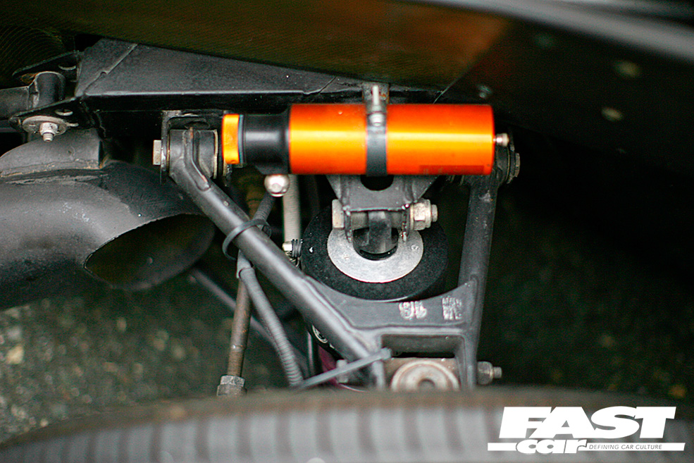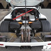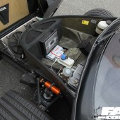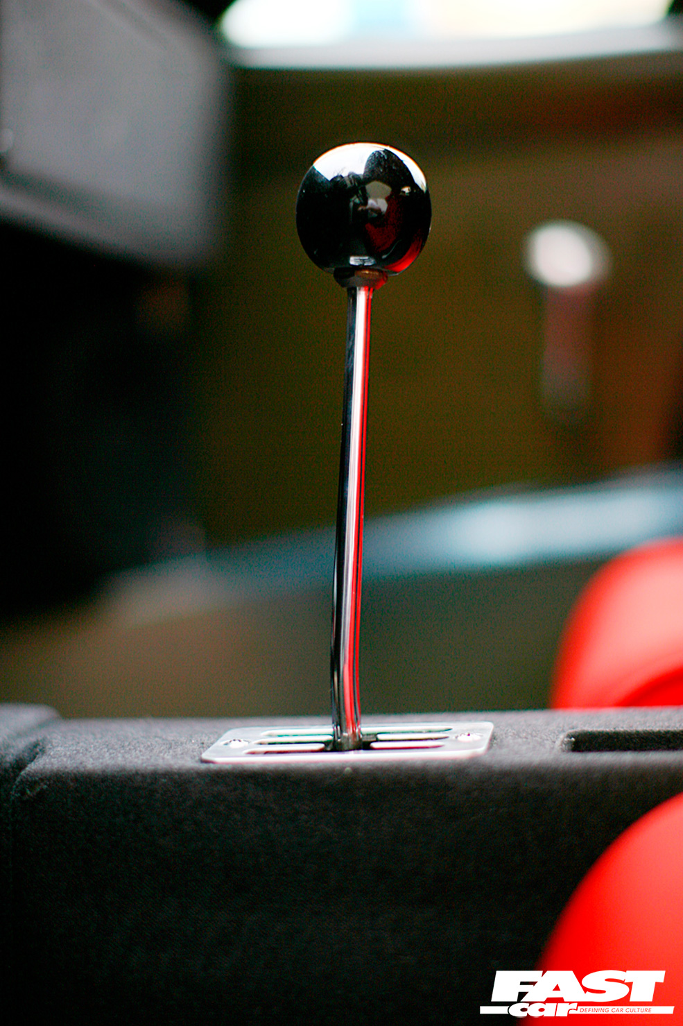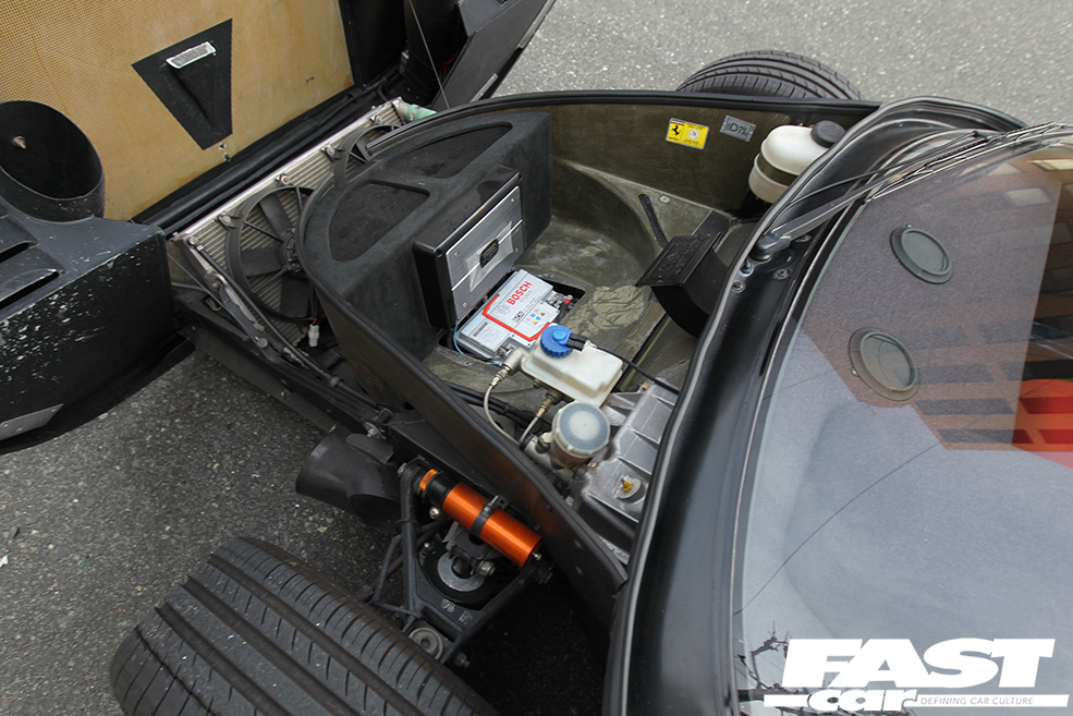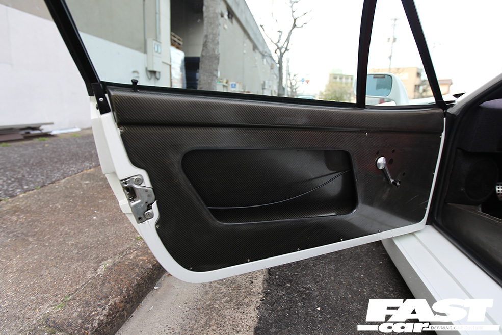 It’s when we open the paper-light carbon fibre doors that we kind of gather that Kato-san must have quite a sense of humour. In the minimalistic interior, aside from a steering wheel, three pedals and the old school Ferrari gated shifter, it’s the Pioneer headunit that stands out. There is no way in hell that you could listen to music in this car, not with the racket the straight-through exhaust makes! Kato even added a Pioneer amp and a pair of high-end Pioneer speakers, but as he tells us, he can’t remember the last time he turned it on!