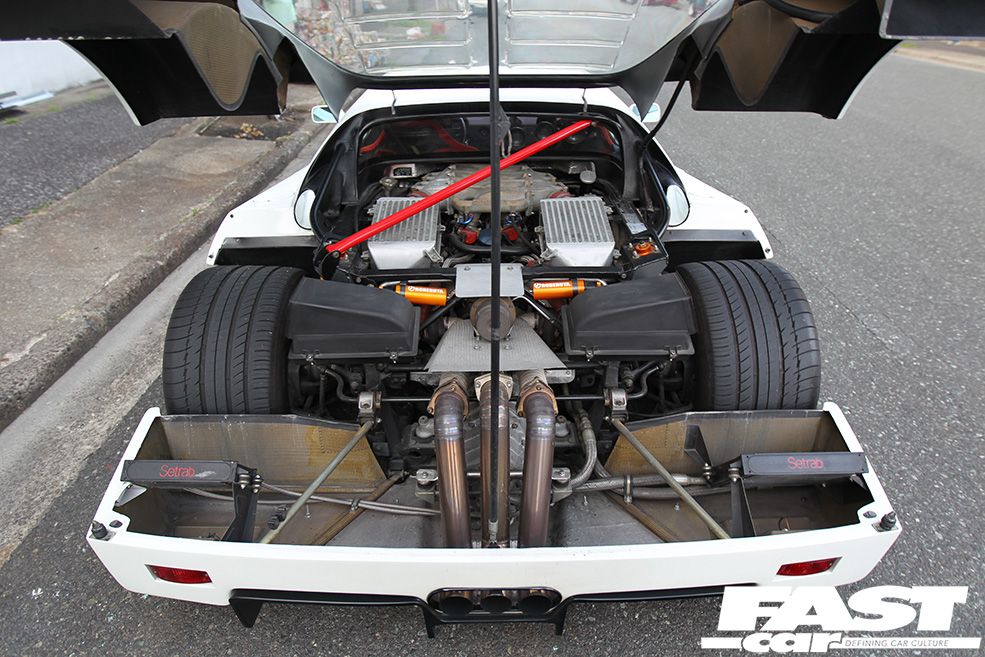 While the engine, complete with twin IHI turbos has been left stock, Kato-san spiced things up a little with a very naughty looking exhaust system. It’s literally three straight pipes – two for each of the turbos’ outlets – one for the massive external wastegate. This helps liberate a few horses and sharpen up the throttle response, but it’s the sheer noise it creates that firmly cements itself in your brain. This thing is seriously LOUD!