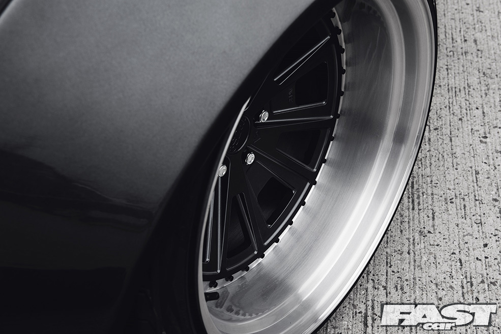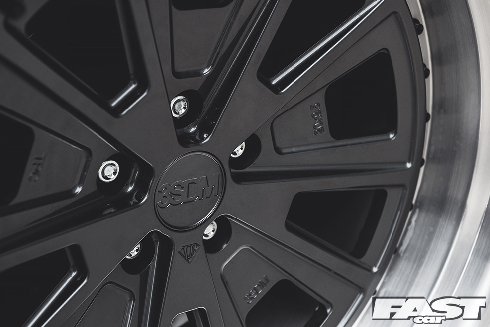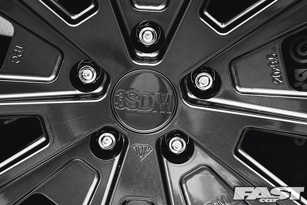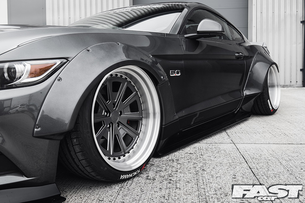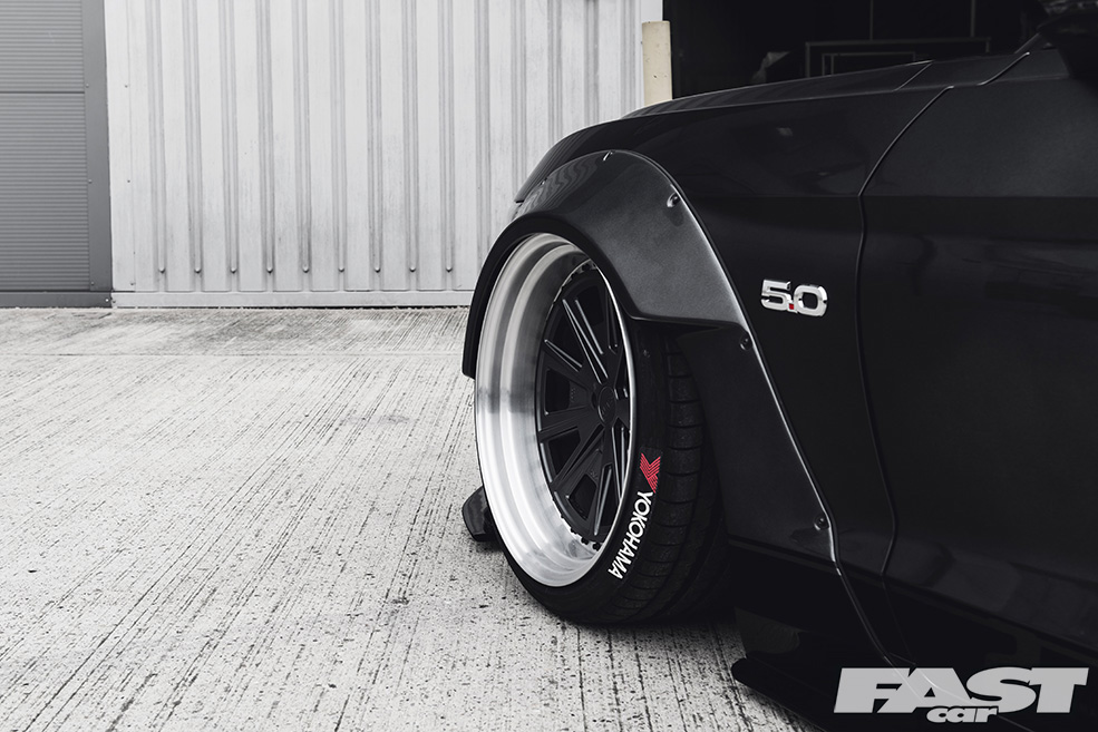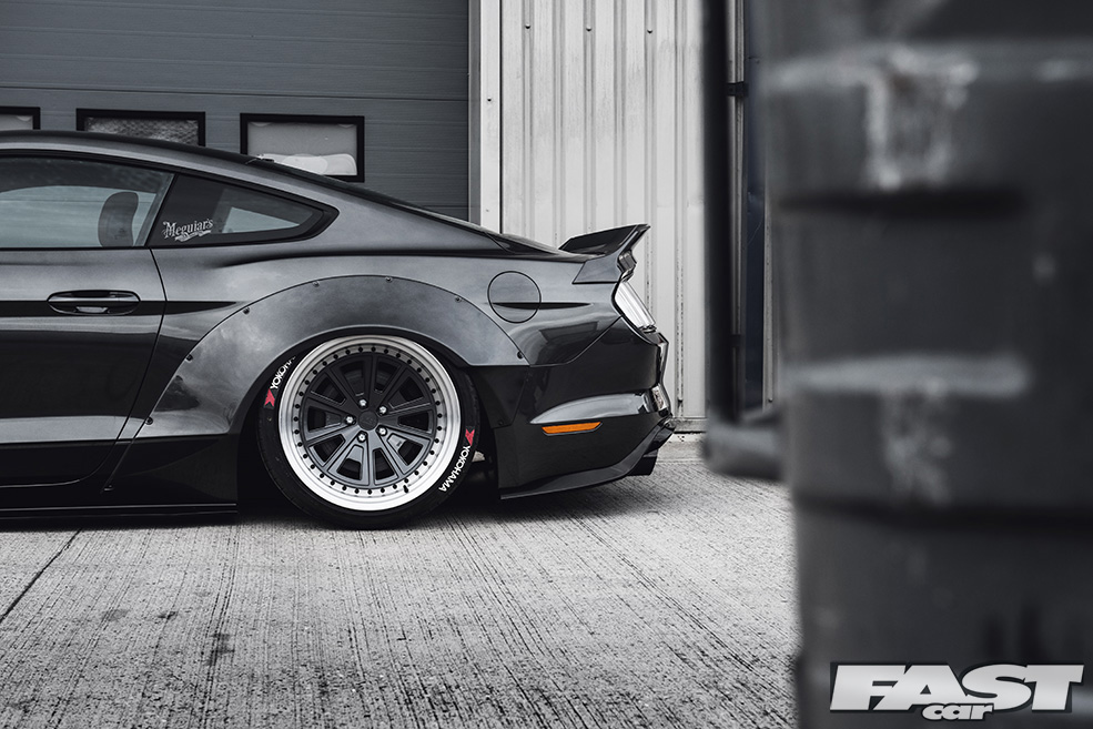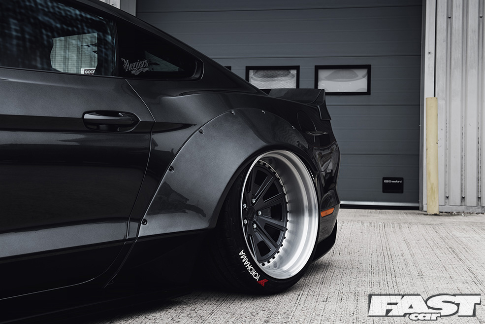 Said air suspension has allowed Indy and the rest of the team to nail a stance that’s pretty much perfect, though this has as much to do with the wheels, massive 3SDMs at all four corners, as anything else. Massively wide aftermarket alloys have been popular for many years now (and you could argue that they always have been, certainly if you’re old enough to have seen late ’70s Cortinas sporting deep-dish slot-mags), though the 3SDMs now gracing the Mustang really do take things to another level. A beefy 9×20in at the front and a frankly insane 12×20in at the rear, the wheels are very much the icing on the cake as far as the Liberty Walk crew are concerned.