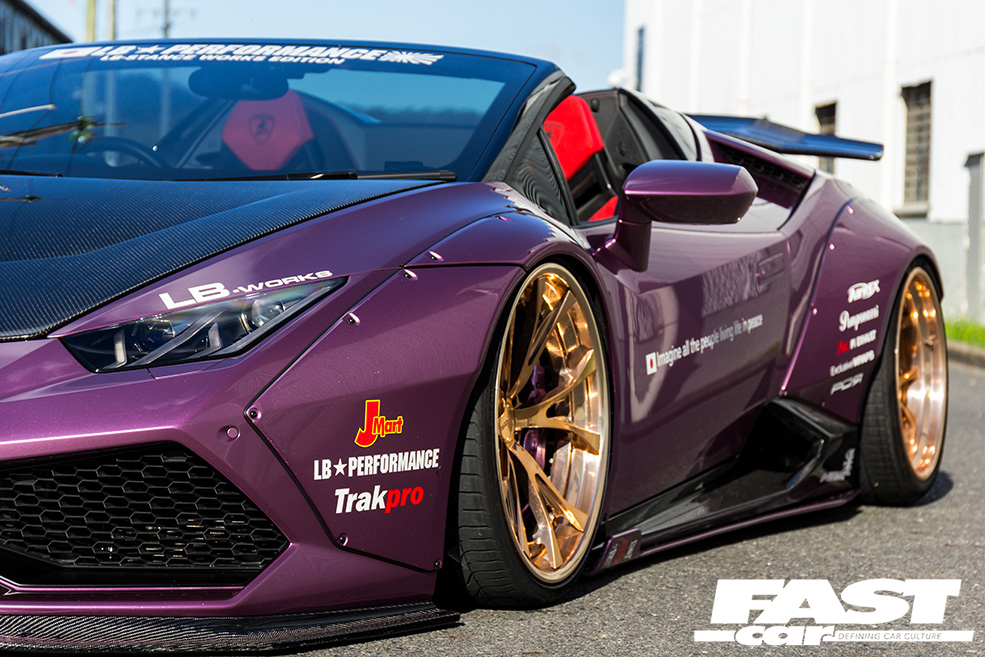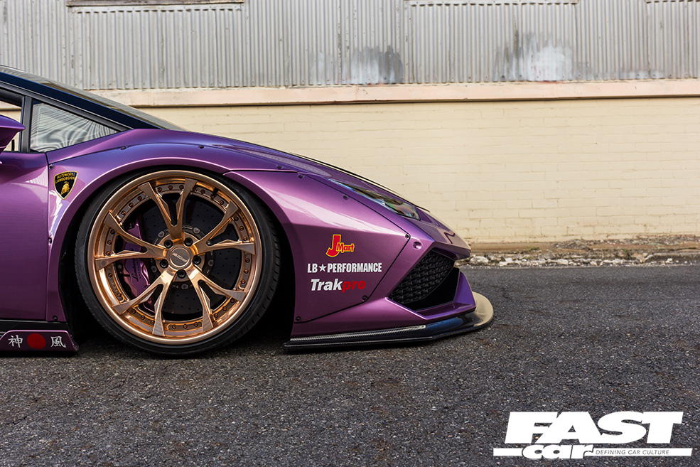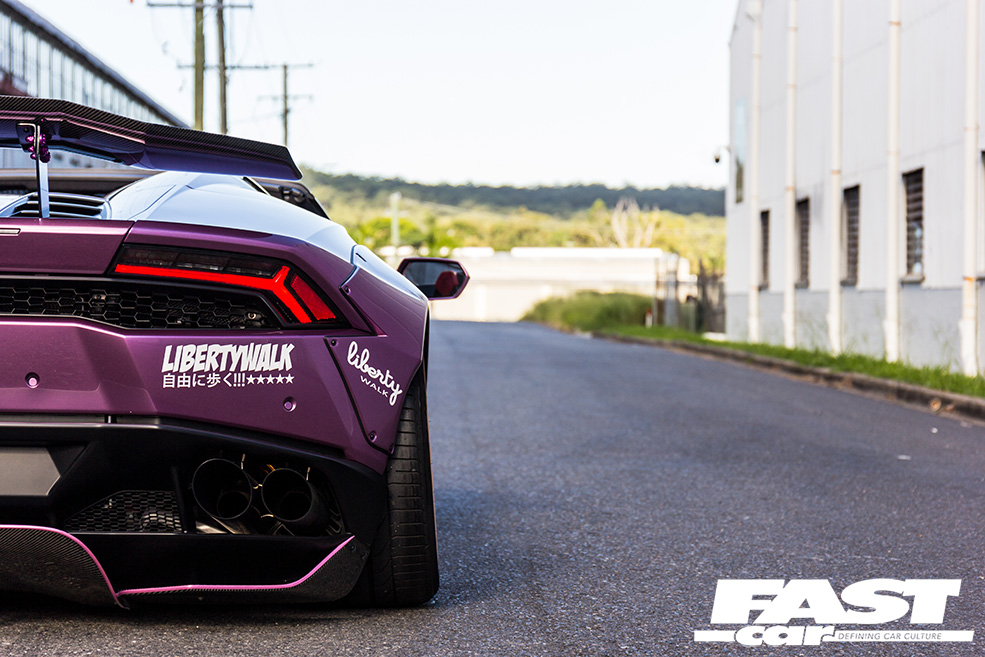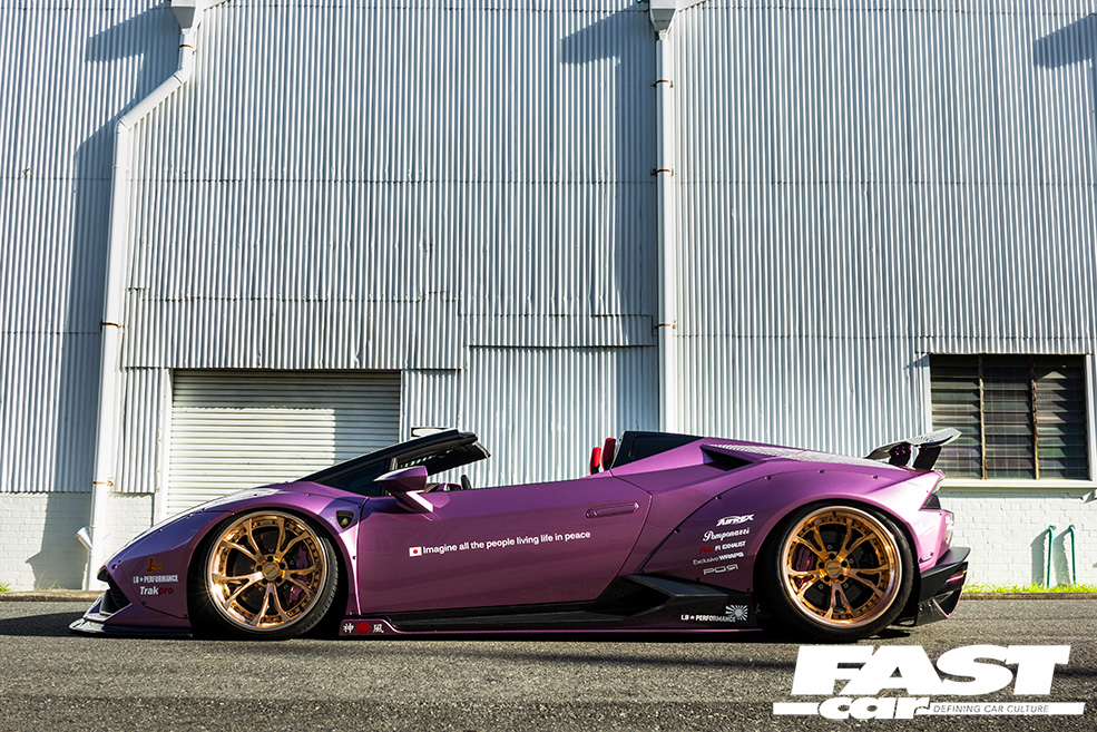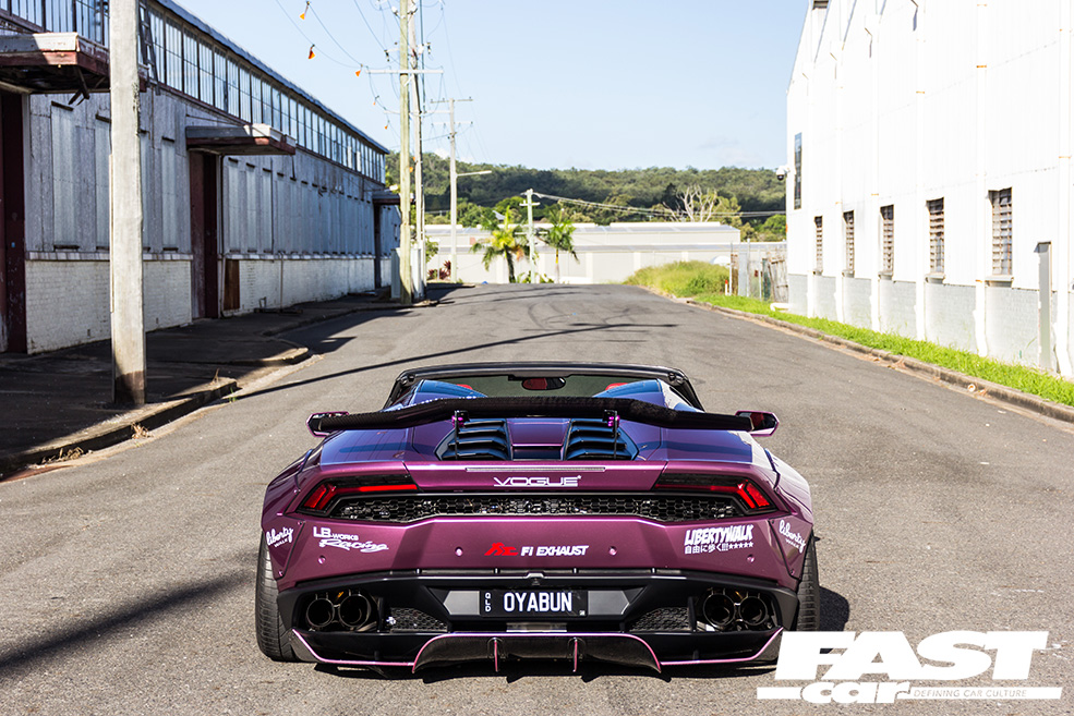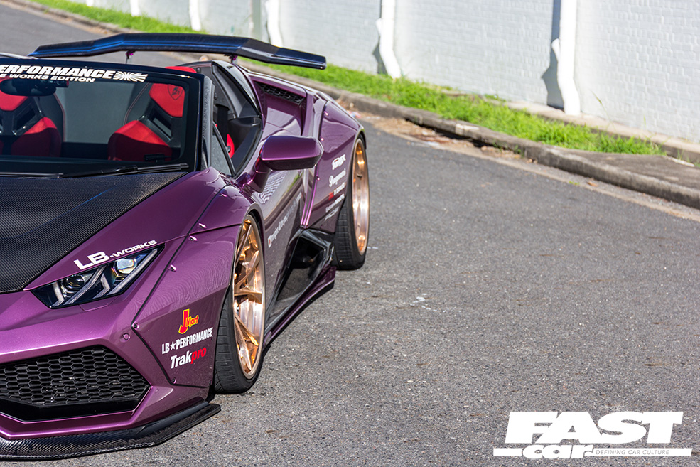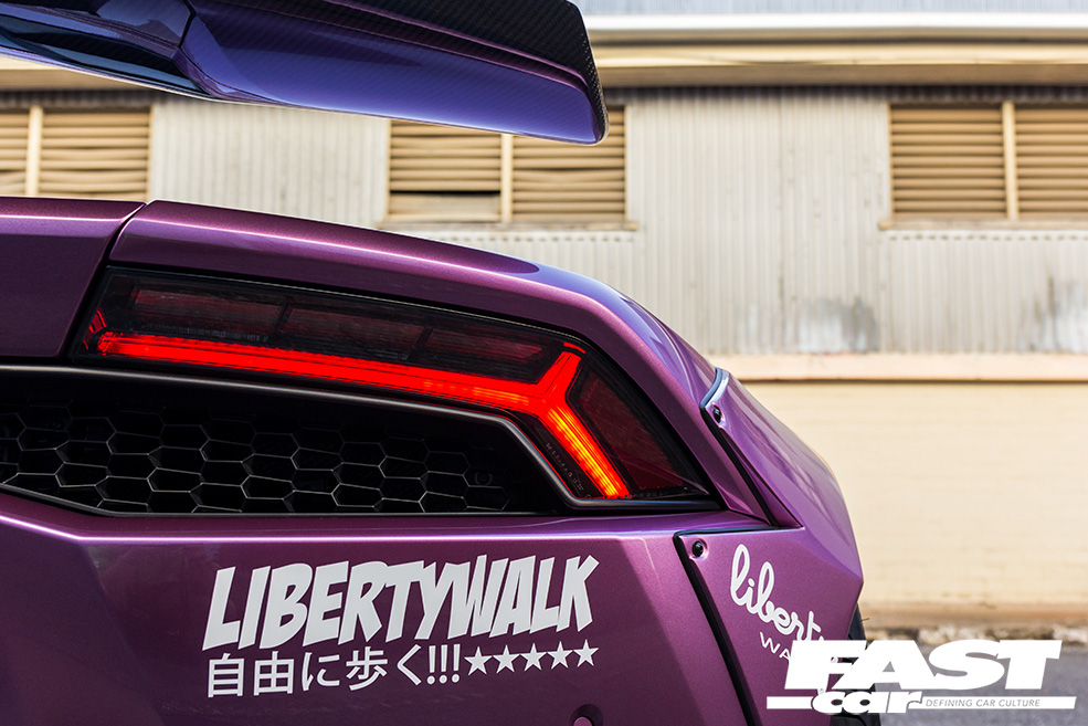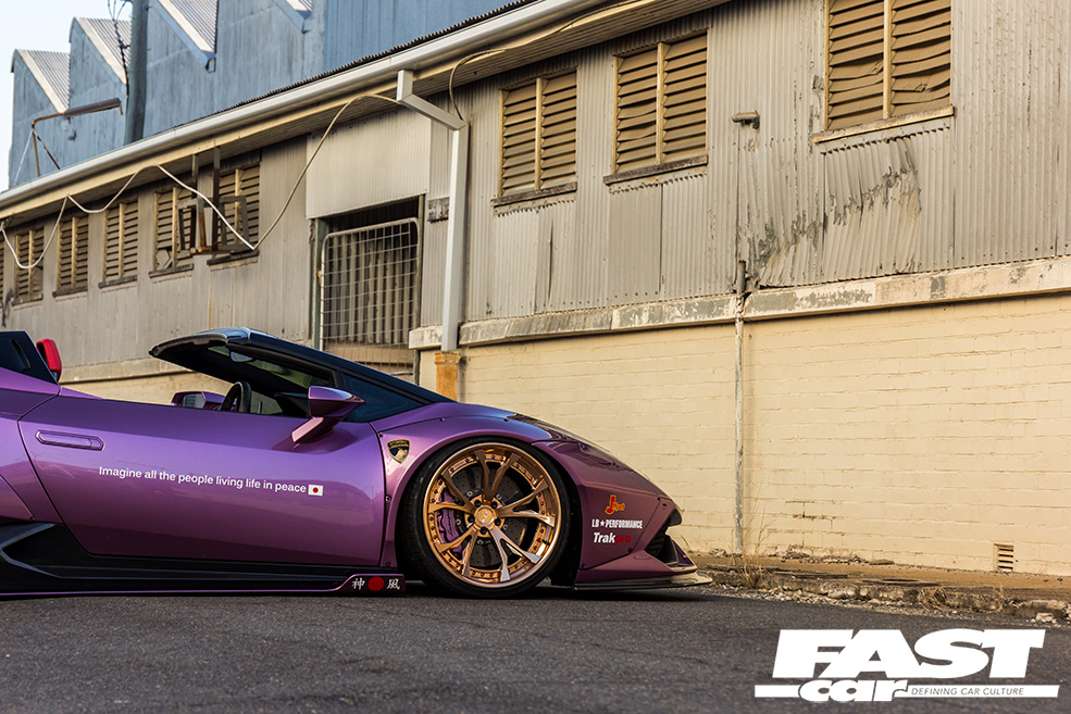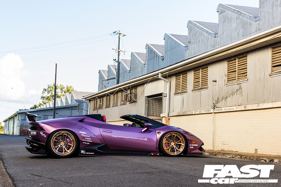 “I was reluctant to cut the guards off a brand new Lamborghini,” Justin admits, totally understandably. “But when I went to Liberty Walk in Japan, I was so impressed with the company’s work and craftsmanship, and the culture they’ve created for car enthusiasts, so I jumped into ordering the kit right away! The full widebody kit was supplied by Vogue Industries, who are also known as Liberty Walk Australia, which I then brought to Camerons Bodyworks in Brisbane to get it fitted and painted.”