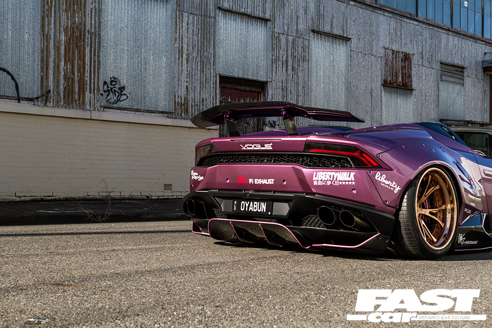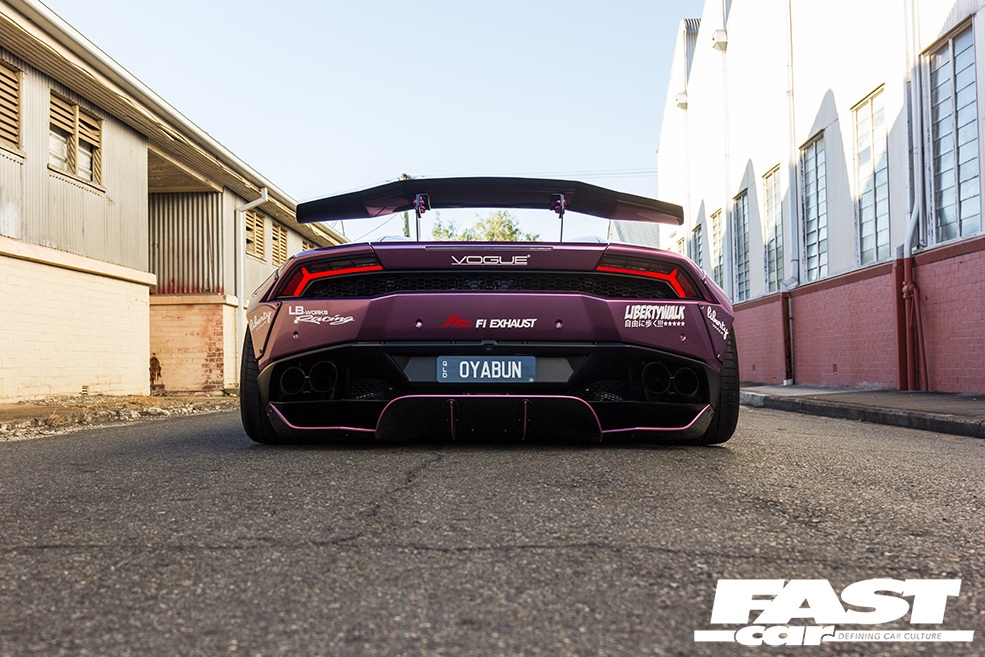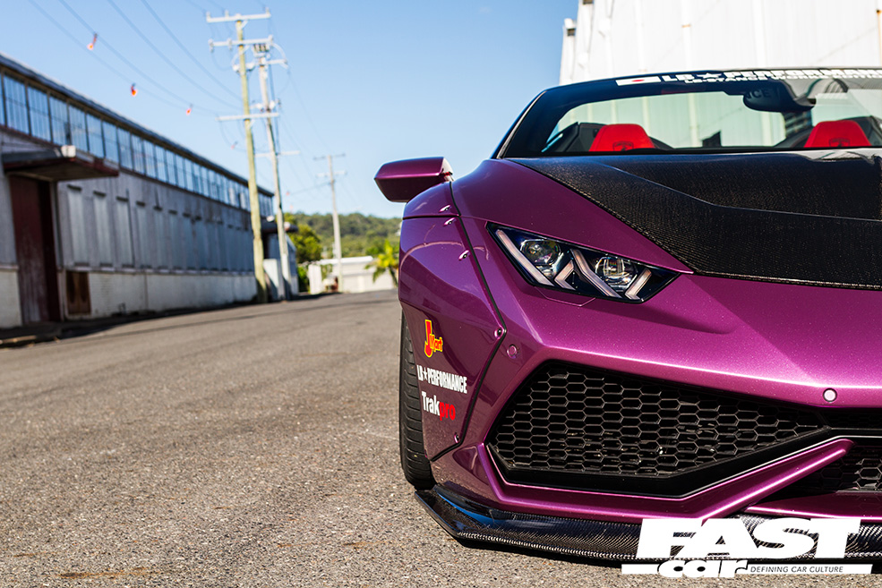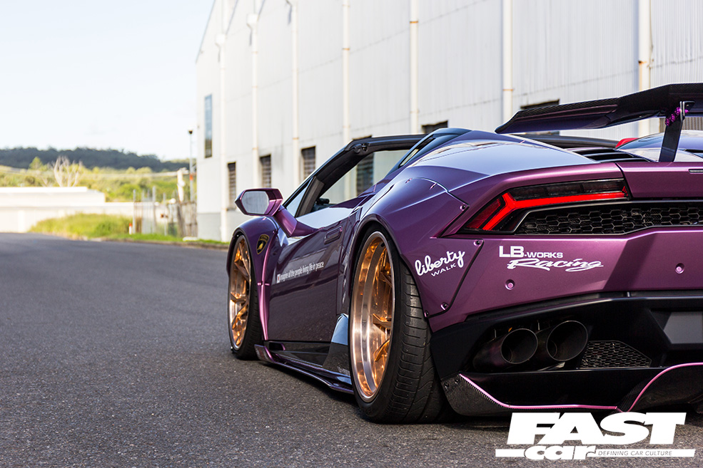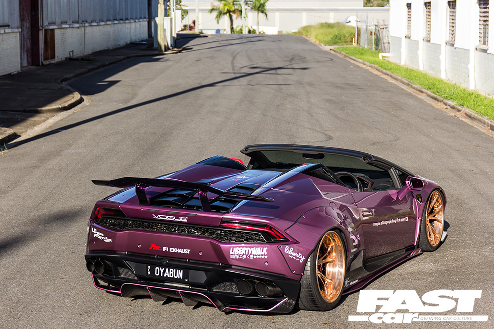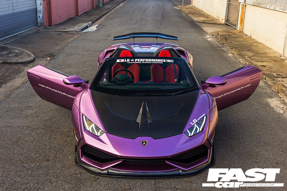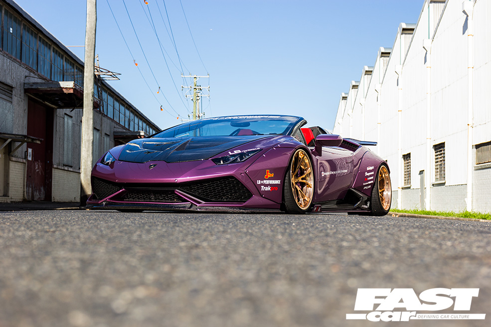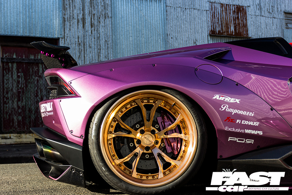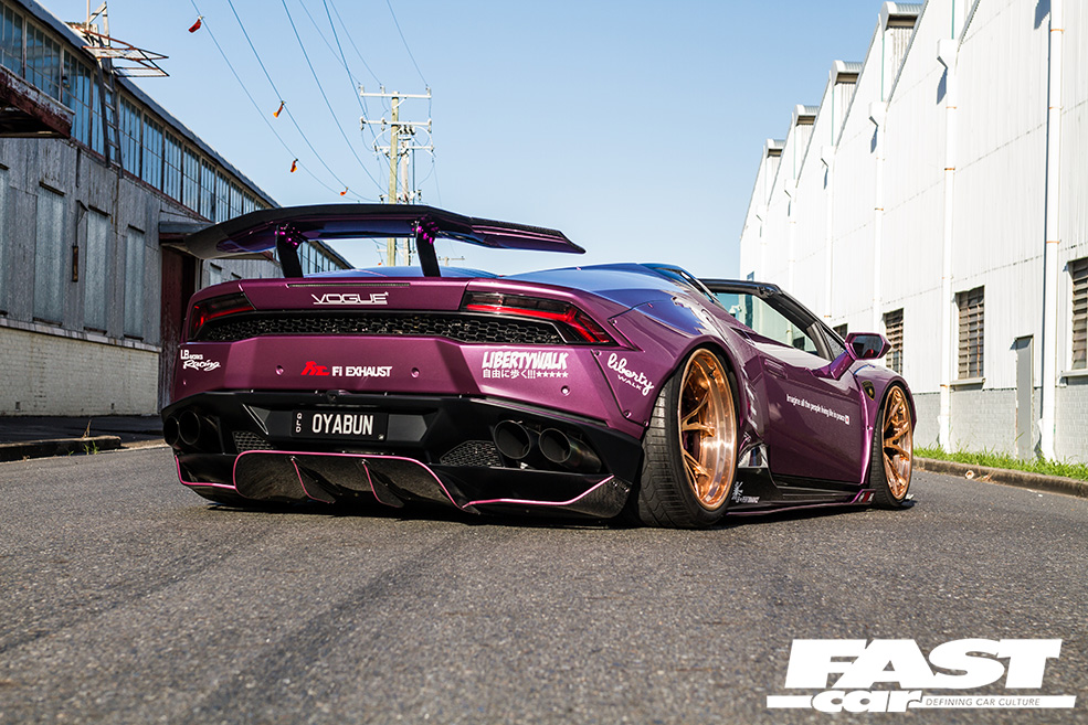 “I was reluctant to cut the guards off a brand new Lamborghini,” Justin admits, totally understandably. “But when I went to Liberty Walk in Japan, I was so impressed with the company’s work and craftsmanship, and the culture they’ve created for car enthusiasts, so I jumped into ordering the kit right away! The full widebody kit was supplied by Vogue Industries, who are also known as Liberty Walk Australia, which I then brought to Camerons Bodyworks in Brisbane to get it fitted and painted.”