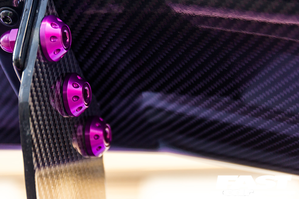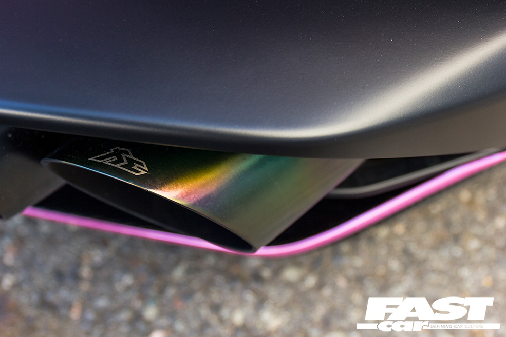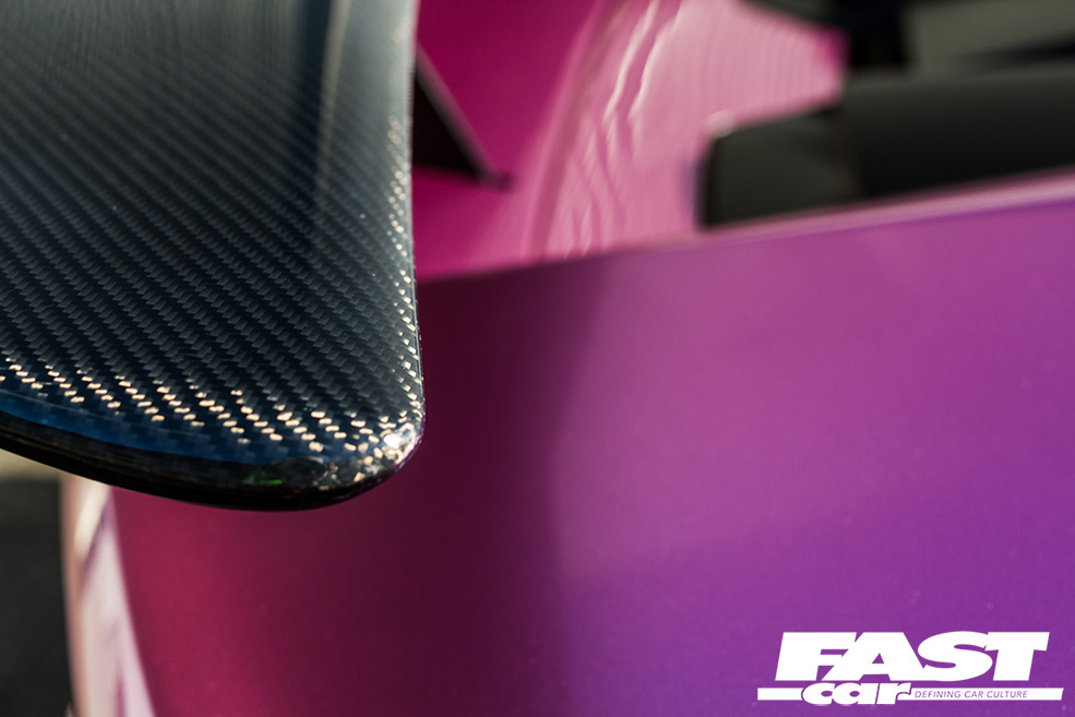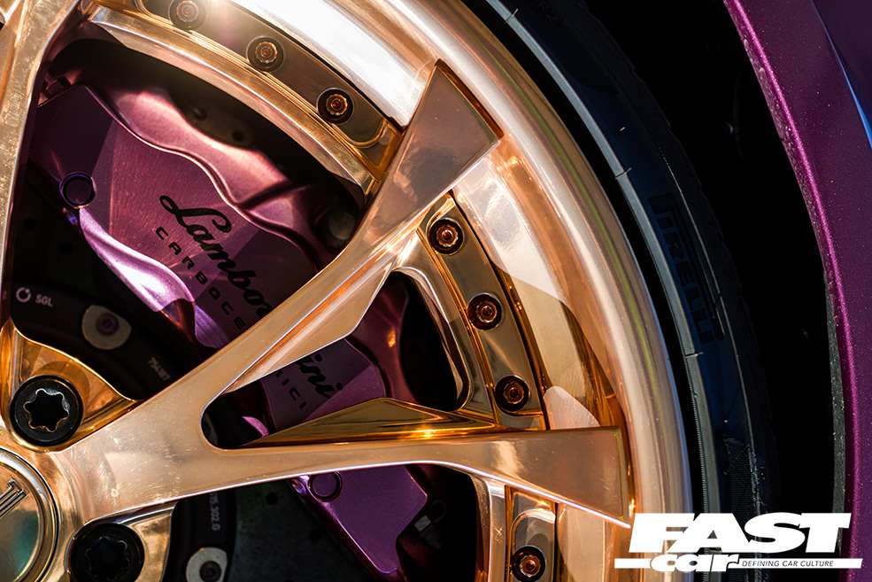 In terms of broadening the contact patch, it was PUR Wheels who answered the call. Their LX11 design is a forged three-piece beaut in a deep-concave setup; Justin’s opted for a 20” diameter here, with 9.5” of width up front and a mighty 12.5” at the rear – which is enough to fill out those colossal purple hips nicely! The rose gold finish offers a classy contrast too; it’s not a blingy, yellowy gold, but something more mellow that works with the creamy, powdery, retro Viola of the SE30.