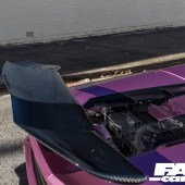 Another key consideration was how the car would sit. Extra width means a broader footprint is required, and the thing would look nuts at stock ride height with all this additional bodywork carried out. So to address this, Justin sourced a bespoke air-ride setup from AirREX to provide the requisite levels of hard-parked lows and everyday drivability. When the car airs out and dumps itself in the weeds, that fat purple brute looks absolutely sensational, but Justin needn’t be fearful of speedbumps either!