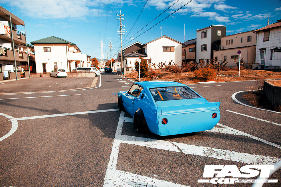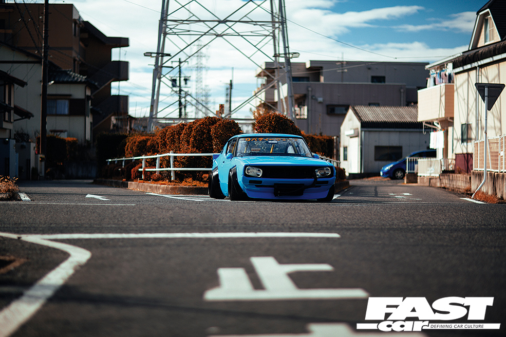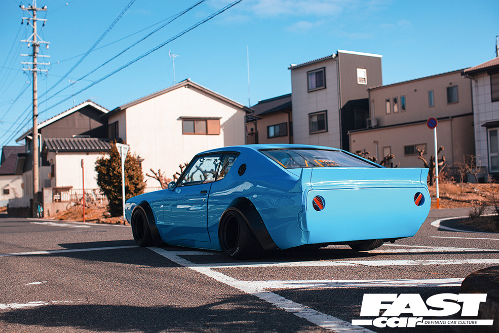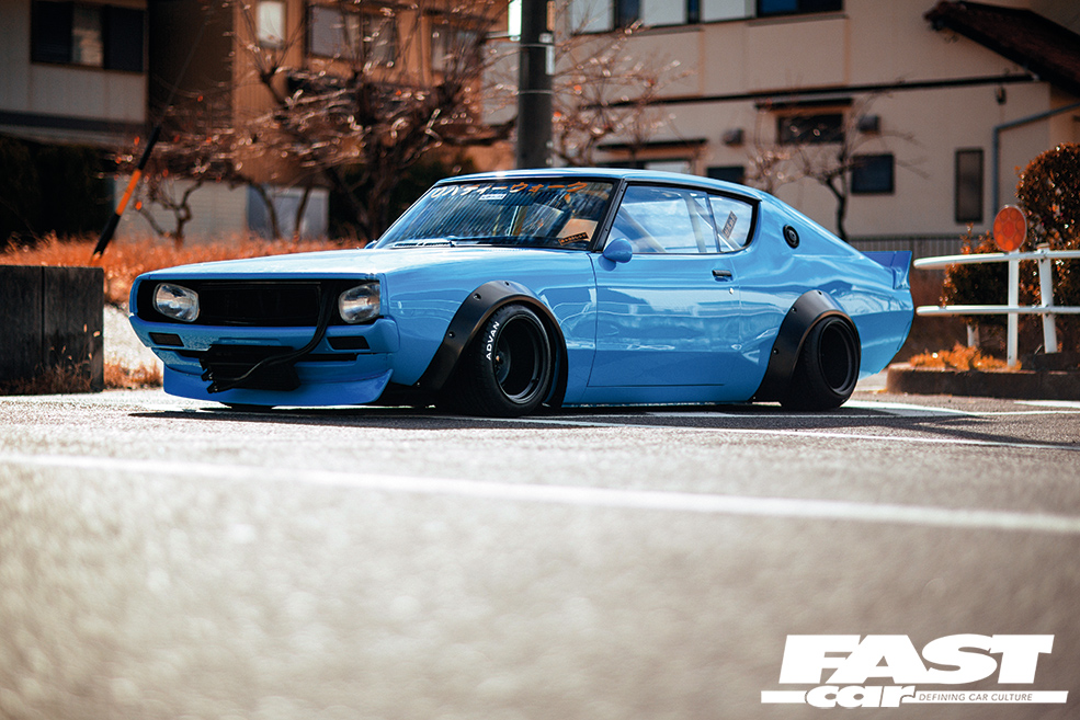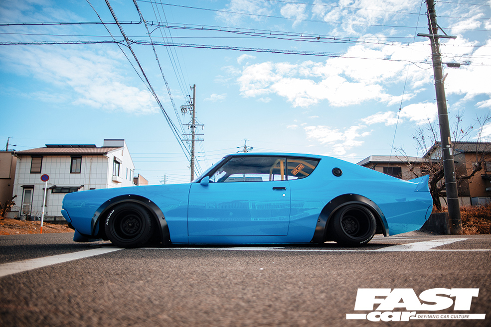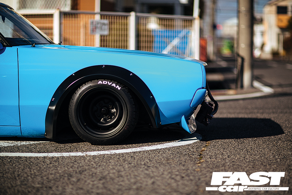 When you see this tuned Nissan Skyline Kenmeri in the flesh, the first thing that strikes you is the colour scheme. The fresh baby blue paint comes as a bit of a shock initially, but once your eyes have adjusted, you’ll realise that it only serves to enhance the sexy lines of this 2-door. Next, you’ll gawp at just how much wider this beast is than any other C110 Skyline out there. Kato’s LB Performance garage, with the help of the legendary Mizuno Works, riveted on the widest arches they could find, and then banded some old-skool steelies to a ridiculous 13in girth on the rear to fill ‘em out nicely. ‘What about tyres?’ we hear you ask! We put this very question to the man himself, who jokingly explained that only some ex-racing Advan wheels were up to the job, fitting the old-school racer theme rather nicely we think!