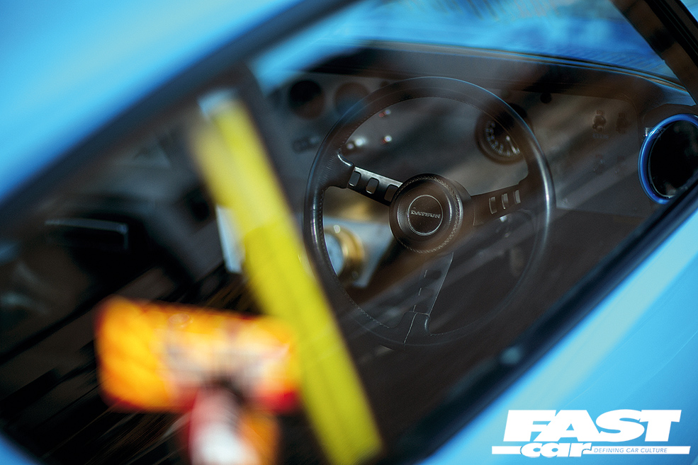 Open the door to find a beautiful ’70s-racer inspired interior staring back at you. The Datsun racing seats and steering wheel are about as rare as finding a unicorn covered in fifty pound notes down the back of the sofa, but Kato-san knew they were essential to complete the look. A wild yellow half-cage is the only modern touch to the internals, and the contrast works as perfectly as the rest of the car somehow manages to.