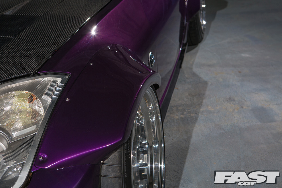 The quest moved in the direction of Florida-based Fiberglass Mafia, an up-and-coming firm that’s setting the East Coast on fi re right now with some killer flared arch applications. Its four-piece kit trumps that of its rivals by offering a pretty colossal 2.25-inch and 3-inch extra width on each side (front and rear respectively). After hearing no other 350Z was rocking this package in Europe at the time, Nick pressed the button and got it ordered sharpish.