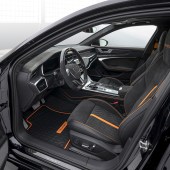 Deep Black paint with orange racing stripes and pinstripes, Mansory carbon-fibre bodykit inc. sideskirts, front splitter, rear diffuser, front bumper and canards, upper and mid-level rear spoilers, vented carbon bonnet, gloss black Audi rings