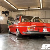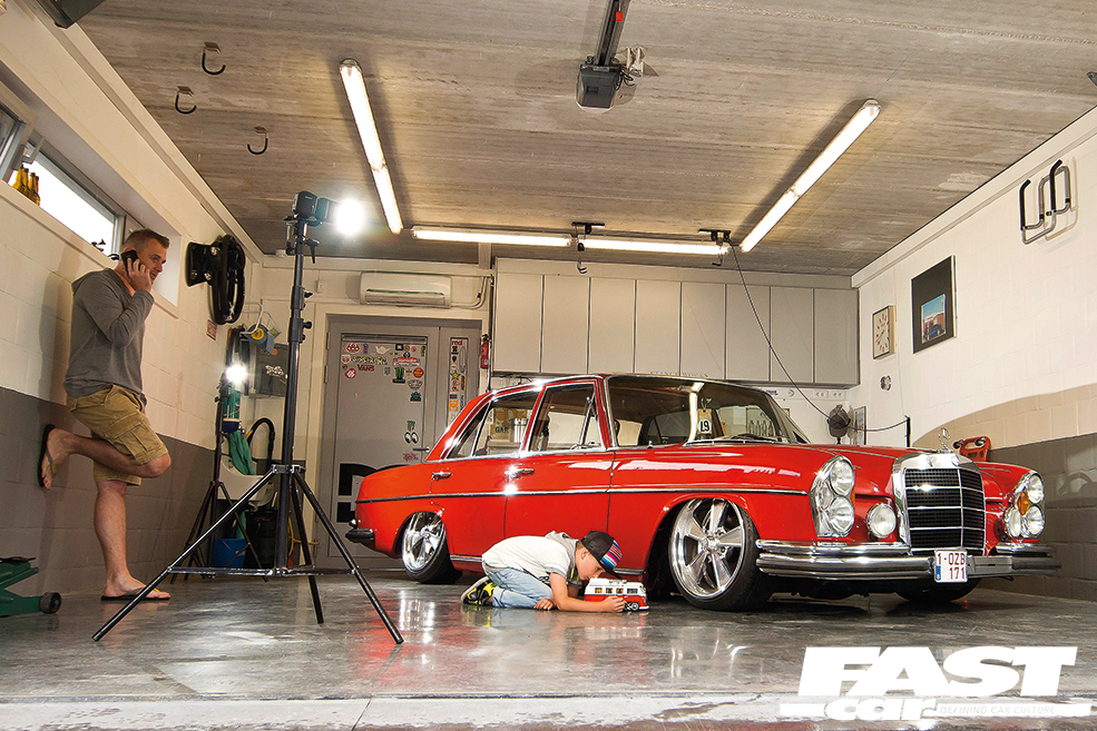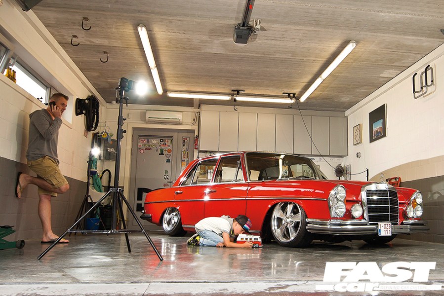 From what I can make out the W108 chassis Merc was his childhood dream car and, when a local car collector was thinning out his garage giving Andy first dibs on this one, it was an opportunity he just couldn’t resist. Being a low mileage, last-of-the-line 1972 car it was mint too but, with a history of modifying every motor he’s ever owned, it didn’t take long before Andy had it slammed over a set of custom American hoops from Intro wheels, on a home made air-ride system. Apart from a properly posh Kenwood audio setup, that’s about it. There really isn’t that much too it.