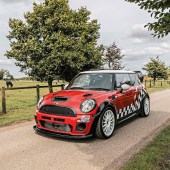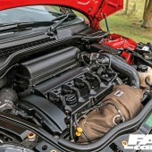 1.6-litre turbocharged Prince engine, Airtec intercooler, Turbosystems 03-0163 hybrid turbo, Forge blow-off valve, Scorpion de-cat with OEM JCW exhaust system, K&N panel filter in OEM JCW housing, solid lower engine mount, air-con delete, Stage 3 remap