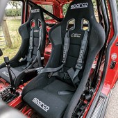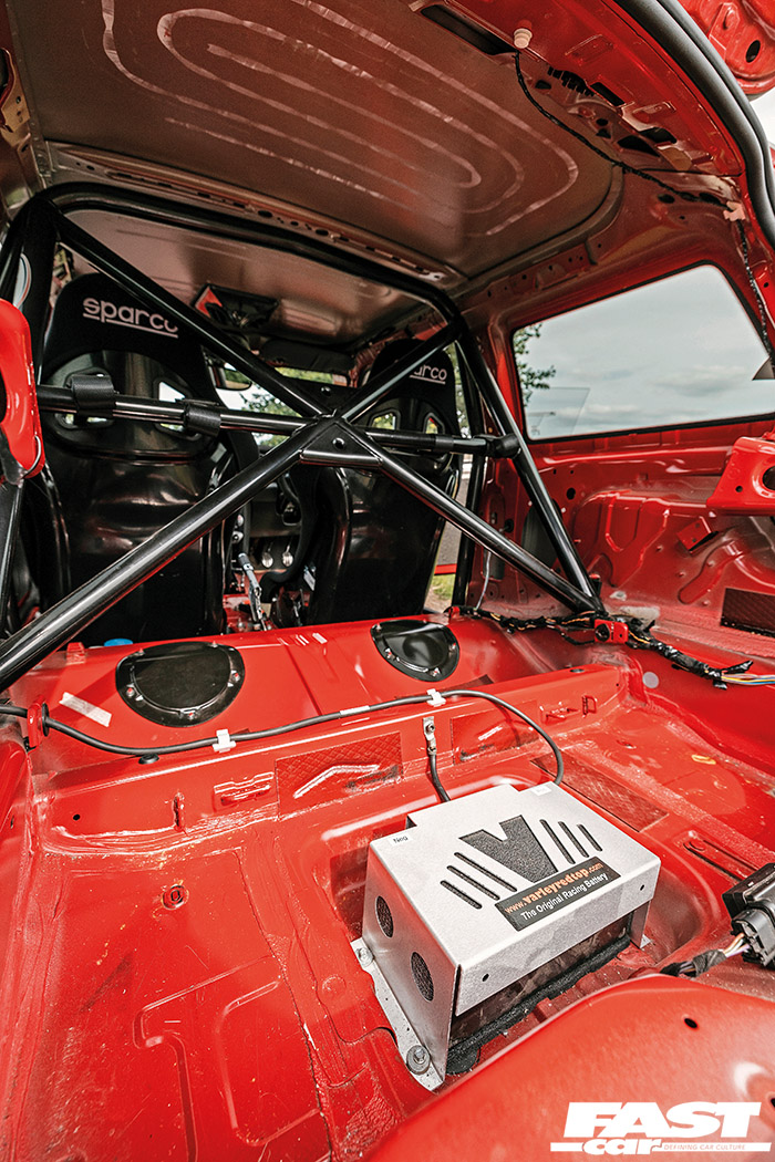 With the rally look and feel now sitting front-and-centre in the gameplan, the cabin was addressed with ruthless efficiency: everything superfluous was stripped and binned, including the air-con, carpets, window glass (replaced by lightweight polycarbonate), and the heavy airbag steering wheel, ousted for a lighter, chunkier and gripper item. “I made Kevlar floor trays, along with my own carbon door cards to suit the look,” says James. “A smaller competition battery was relocated to the boot, and a smaller windscreen washer bottle just behind the passenger seat. This gave me space in the engine bay and made things tidier as I went.”