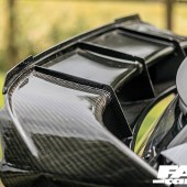 Custom wider arches (with inner arches trimmed), brake ducts fabricated for spotlight apertures, custom WRC-style matt carbon bonnet vents, vented front bumper, polycarbonate windows, functional carbon roof vent, carbon bonnet vent, custom rear spoiler