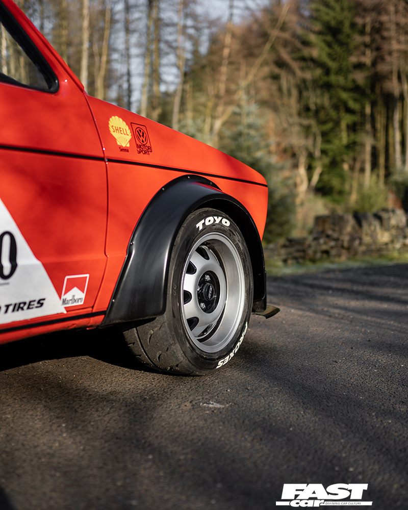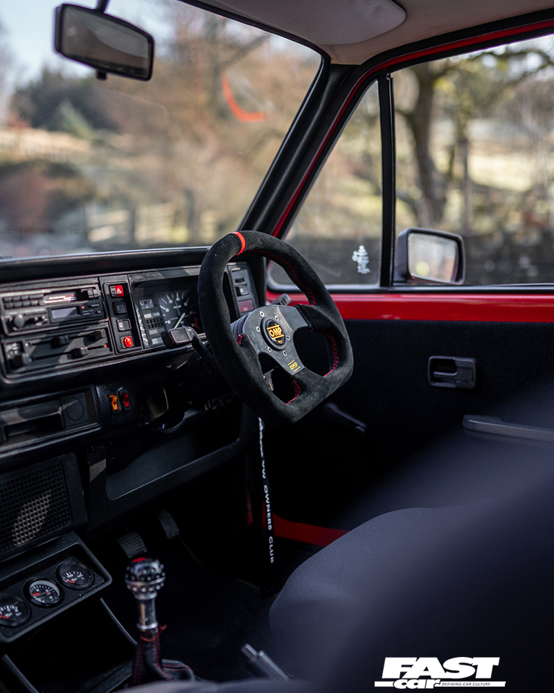So this was never going to be a case of simply dropping a stock 1.8T into the Mk1 and seeing what happened. The AUM was treated to a K03S turbo along with a custom air intake, a bespoke 2.5in downpipe, and a straight-through stainless steel exhaust system. Naturally a little ingenuity is required when you’re fitting an engine somewhere that it ought not to be, and sparkles of this lateral thinking can be found liberally sprinkled throughout the engine bay. The intercooler was originally designed for a Mercedes Sprinter van, while the radiator that’s neatly wedged into its compact slot is a Mk2 Golf item with twin fans. With a Stage 2 remap, peak power is up to a hysterical but still eminently usable 246bhp. And it follows that further magpie parts liberation would be necessary throughout the install – after all, throwing that sort of grunt through the stock Golf C’s transmission and driveshafts would most likely have everything melting like chocolate in no time, so Lee has sensibly upgraded things a bit… the gearbox is an 02J five-speed unit from a Mk4, while the driveshafts are stronger Mk2 items. Indeed, he’s completed a comprehensive beefing-up throughout the chassis, with the front brakes having been liberated from a G60, and the suspension being totally reworked with KW coilovers, polybushes everywhere, and a whole bunch of bracing to get everything stiffer than a Pfizer test facility. The most noticeable chassis alteration from outside is that the Golf’s running extremely wide wheels – 7in at the front, and a sodding great 9in out back – although you’d be forgiven if your eye wasn’t immediately drawn to those, as it’s the brawny Berg Cup bodykit that’s doing the figurative heavy lifting here. Wide as hell with aggressive race-bred aero to augment the de-bumpered look, it creates a massive visual impact – and the artful livery makes clever use of the original Mars Red paint.