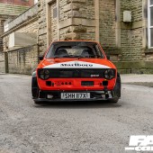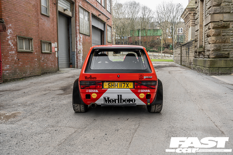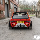 Mars Red, Berg Cup bodykit, custom Marlboro/Senna livery, custom front splitter with air intakes, custom rear diffuser, Hella rear spoiler, custom drilled door handles, bumpers removed, drilled front panel, drilled rear lower panel, custom Mk2 front indicators, smoked lights front and rear, wheelarches cut, rolled, welded and protected with Raptor Seal, additional Mk1 grille to protect intercooler, de-wipered rear, custom Berg Cup 20v badges