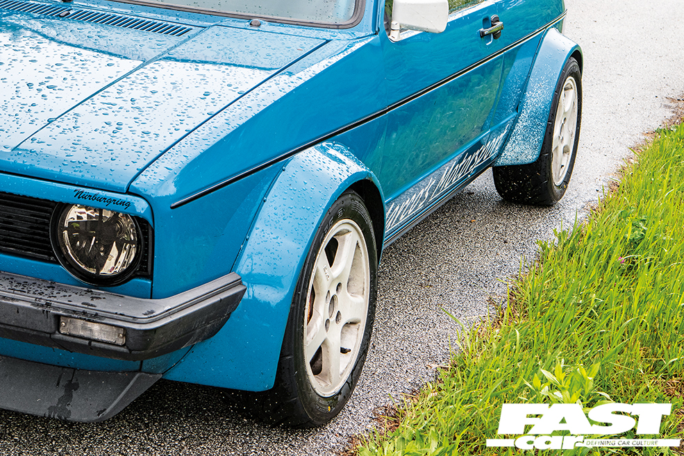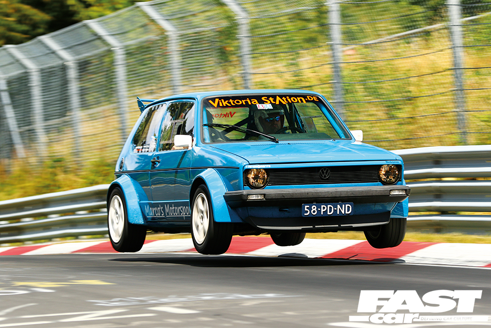 A picture tells a thousand words’? Hmmmm. Balls out at Pflanzgarten, Nurgburgring, a foot in the air at 90mph, into a fourth-to-fifth gear right hander. The Nürburgring is full of motor racing legends but Touristenfahrten – public ‘tourist’ driving – has its own. Hands up who remembers the ‘Ring Mini Clubman van, star of many online videos in the Noughties? Well here’s another. So when Editor Roberts got in touch to say he’d pinned down Dutchman Marco Veldhuis’s Mk1 Golf track toy, the sense of anticipation was palpable. Dubbers from the Nineties know Marco anyway. We all know people by their cars, right? Or at least his previous car.