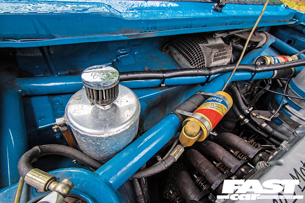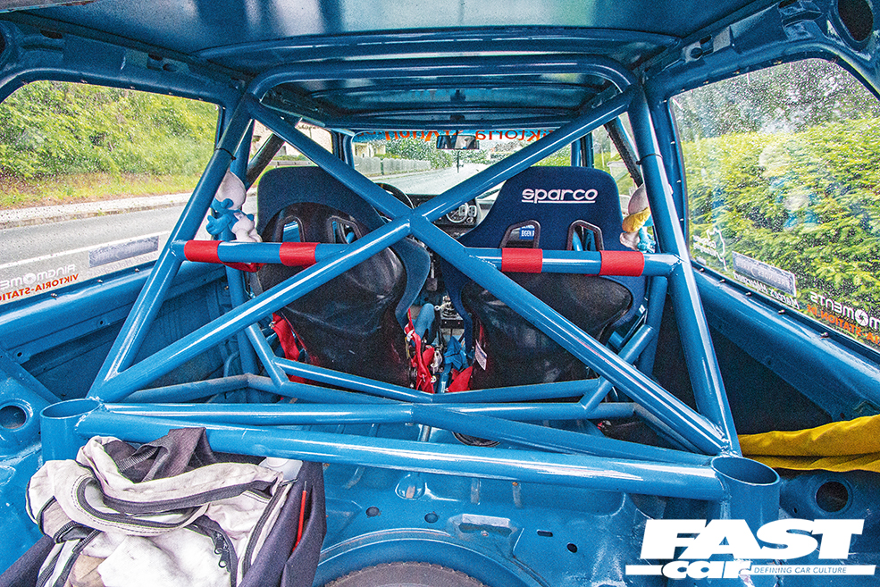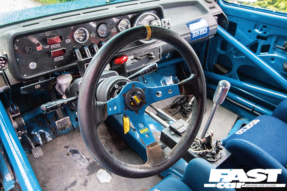 Sparco Corsa bucket seats, Sabelt 3-point 3 inch harnesses, carbon dash inlay panel with minimalist clocks, Autometer rev counter, OMP steering wheel, 1990 Mitsubishi Colt longer steering column, indicator and windscreen wiper levers, gear indicator on ignition cowling, shift light, large oil pressure light, raised SQS non-flatshift sequential gear shifter, Tilton three-cylinder bias brake pedal box, between-seats bias adjuster, hydraulic handbrake, extra fourth pedal for mechanical handbrake for TUV rules, grip tape covered pedals and floor plates, battery box in boot, plus the all-important yellow flag for marshalling ‘Ring track incidents. Seam welded with all underseal removed, multi-point weld-in CDS 2.5mm-wall roll cage to front turrets, with extra sill tubes + lower bulkhead protection, harness bars and chassis bracing triangulation in lower rear.