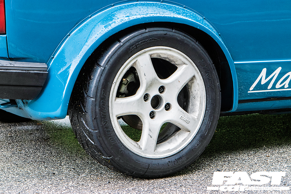 Draw up a wish-list tick-box spec of a Mk1 Golf track car, and you’ll find all or most of what you’re looking for already in the Dub Details side panel: A throttle-bodied 16-valve, six-speed dog ‘box, tubular wishbones, spherical joints everywhere, two-to-three-way dampers and a multi-point weld-in climbing frame.