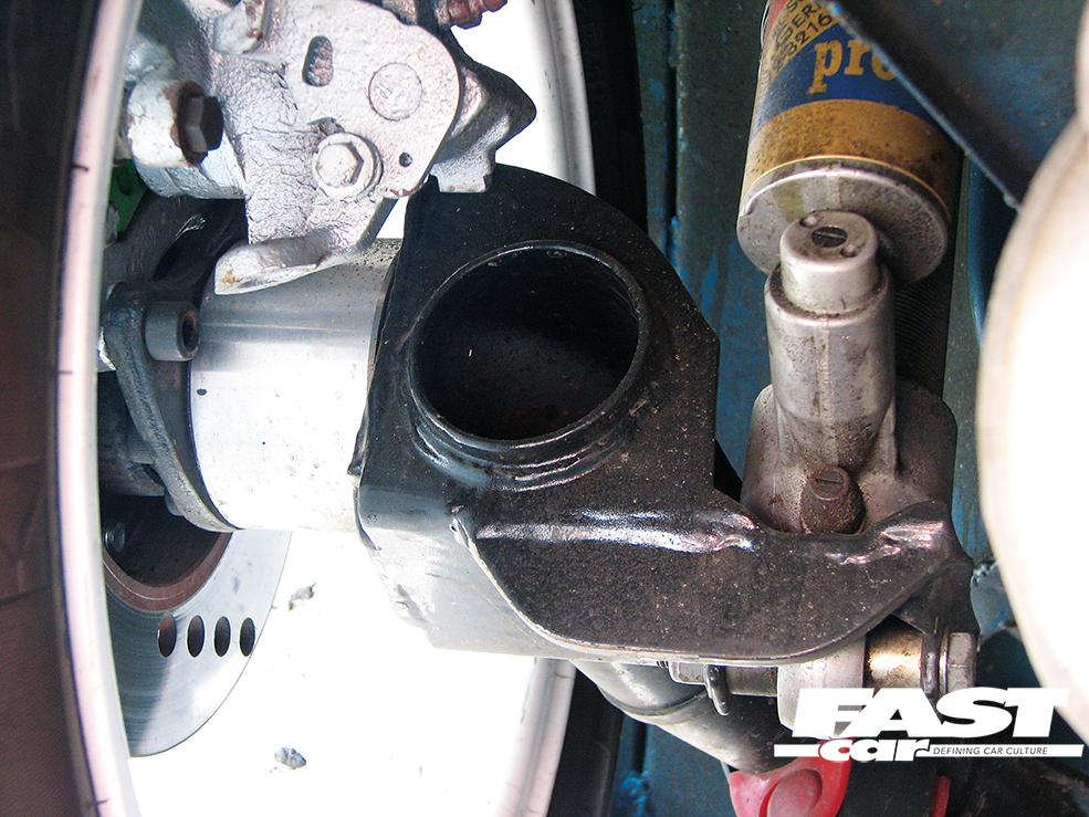 7×15” CMS wheels with Dunlop Direzza 205/50 03G tyres, recently upgraded to 7×17” wheels with Kumho Ecsta V70a tyres. Stud and nut conversion, Brembo Seat Ibiza 4-pot front callipers, 280mm diameter front discs now upgraded to 323mm, mounted to roll-centre optimised modified Golf Mk2 hubs, Carbon Lorraine RC8 sintered brake pads, 6N Polo/Ibiza rear stub axles and discs (upgraded post-wheel off incident). 72-position 3-way front and 48 position 2-way rear external canister adjustable Proflex shocks complete with home-made front spherical eccentric suspension top mounts, Eibach anti roll bars, home-made +60mm wide-track tubular wishbones, widened rear axle via 55mm steel stub axle spacers, all bushes replaced with spherical bearings, braided brake hoses, manual steering rack with lengthened outer joint for wider track