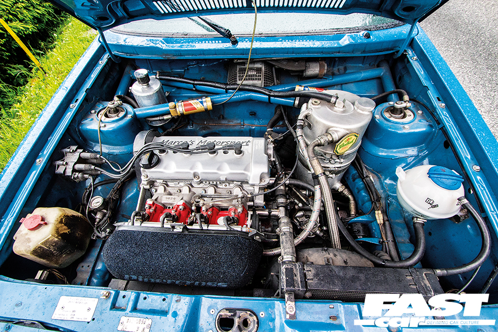 All-steel, dry-sumped, 9A-code Golf 2.1-litre 16v, mapped by JD Engineering. ABF 373’D’ head, 95.5mm 1Z diesel crank, 83.5mm Wossner high-compression forged pistons, giving 2092cc. Low friction engine bore cylinder coating, 144mm Carillo rods, Cat Cams, solid tappets, external and inter-cam adjustable vernier pulleys, oversized Honda valves, uprated valve springs, Lumenition 45mm ITBs, Sorg Motorsport inlet manifold, Jenvey fuel rail, Bosch Audi S3 injectors, Pipercross air filter, MBE 992 ECU, distributor blanked, wasted spark coil pack, external crank sensor-triggered spark timing, Mk1 Golf K-Jet fuel pump, Pace 10 litre engine-bay-mounted oil tank, Pace external oil pump (no oil cooler), Marco’s Motorsport self-built 4-2-1 exhaust manifold, with flexible spring fittings at the head, Marco’s Motorsport 2.5-inch/63mm stainless steel exhaust system with upswept tail pipe. Sachs RCS200 200mm basket clutch with a locally made single sintered disc (non-paddle) and home-made lightened flywheel. Quaife QKE2V close-ratio semi-helical-tooth 6-speed 02A dog ‘box, Drenth plate limited slip differential, spherical-jointed shifter tower linkage. Bespoke lengthened chrome moly driveshafts with BMW inner and Audi outer joints. Performance: 252bhp and 280 NM torque. Max revs 8500 rpm
