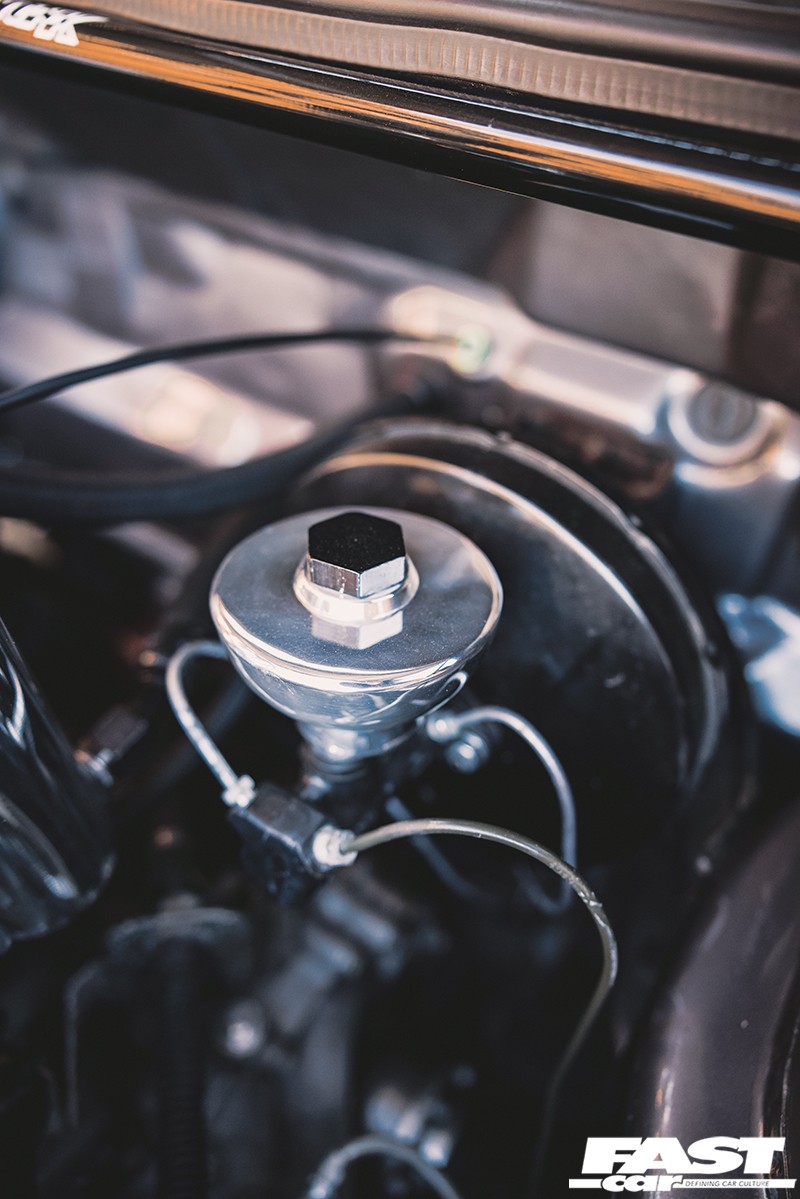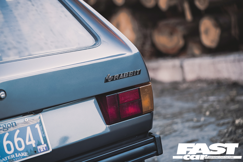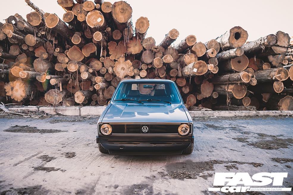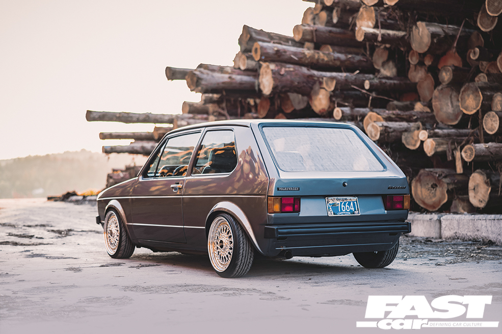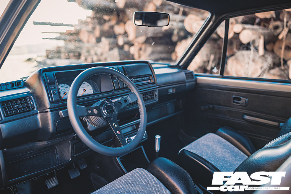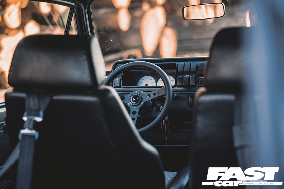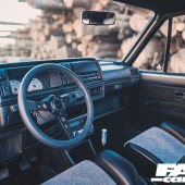 We rarely see a Mk2 dash conversion in a Mk1 these days but it looks at home with the Recaro Trophy seats and the Renown Monaco steering wheel. Black headlining, rear bench delete with carpeted rear deck, a relocated battery in Moroso safety box, harness bar and Schroth harnesses complete the sparse but well thought out and classy interior. The aforementioned sidelight delete, small Mk1 Golf bumpers and CL arch spats give the car a clean Euro look whilst the Rabbit badging acts as a nod to the car’s starting point. Stephen wanted to create a subtle car but have details that enthusiasts would appreciate. It’s certainly one of those cars you would spend a while with, drinking in all the details at a show. Who clocked the ‘postal’ rear lights (devoid of the white reversing lenses) and the clean non-defrost rear screen?