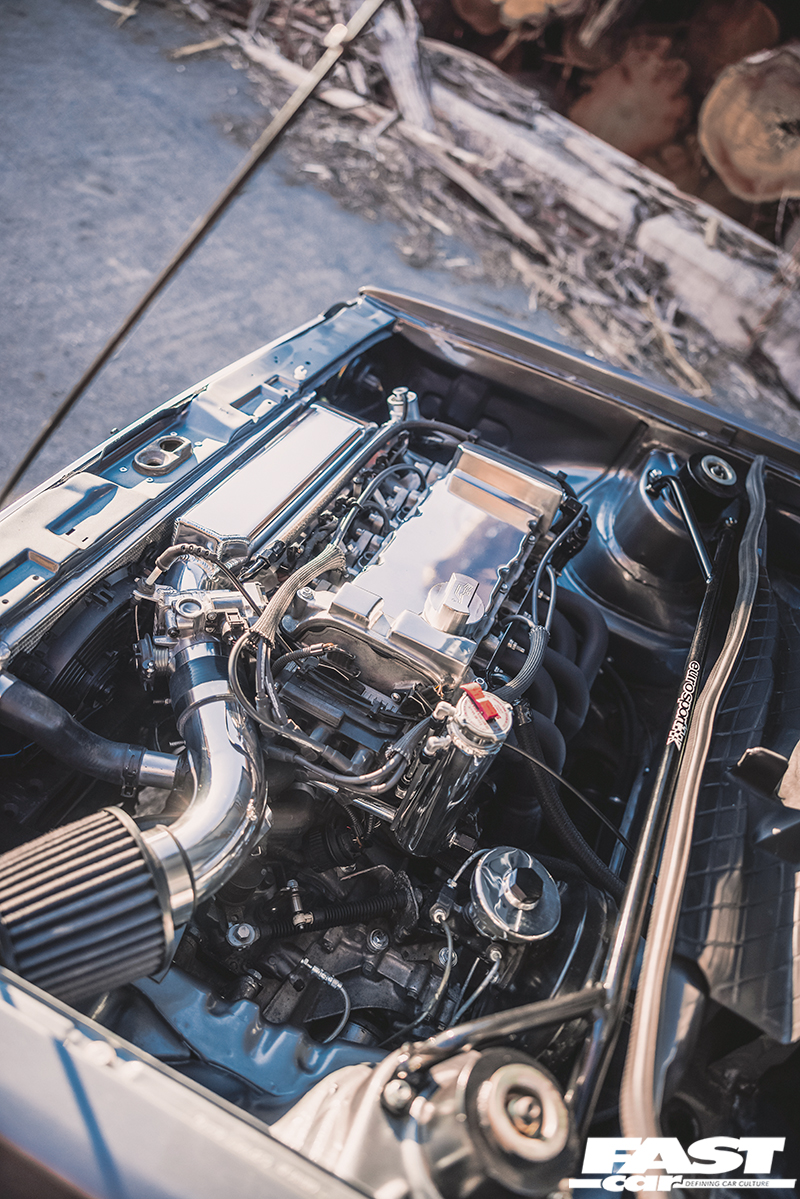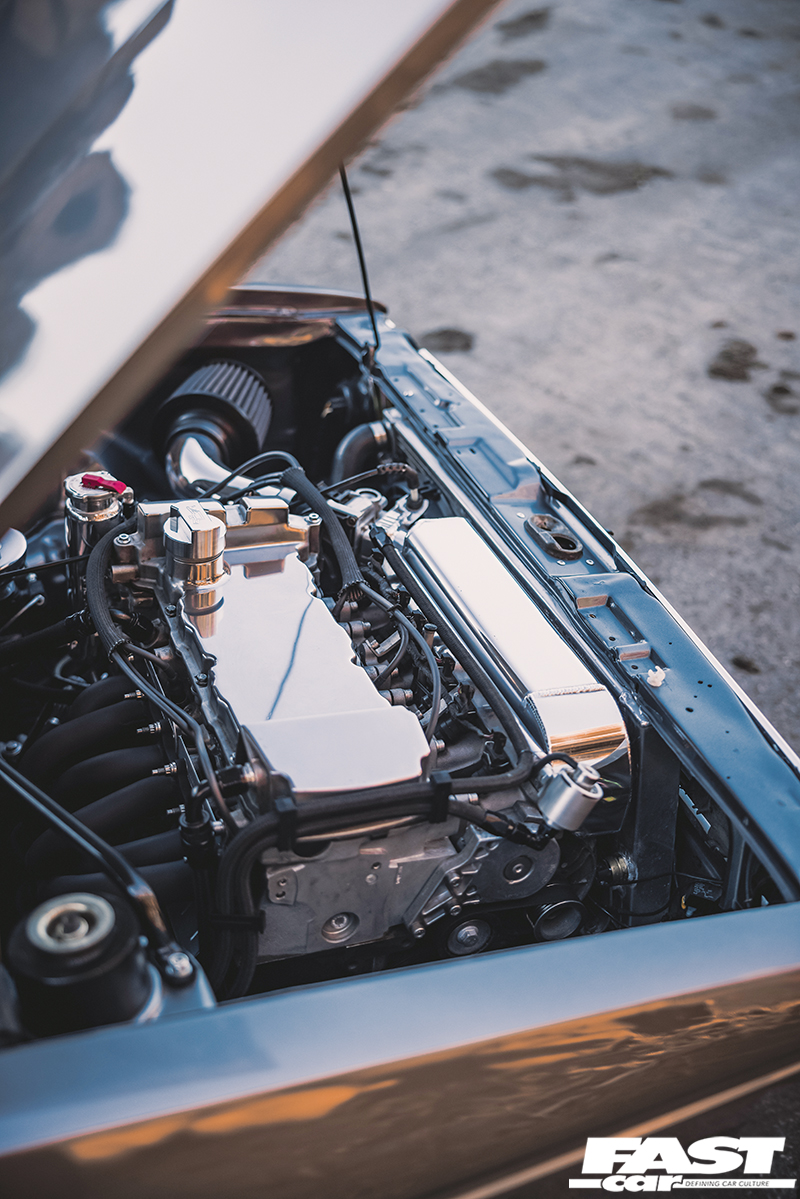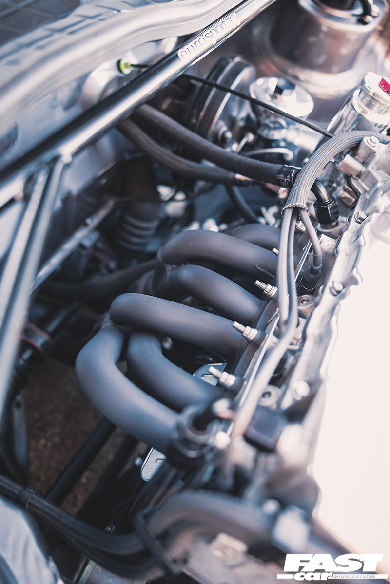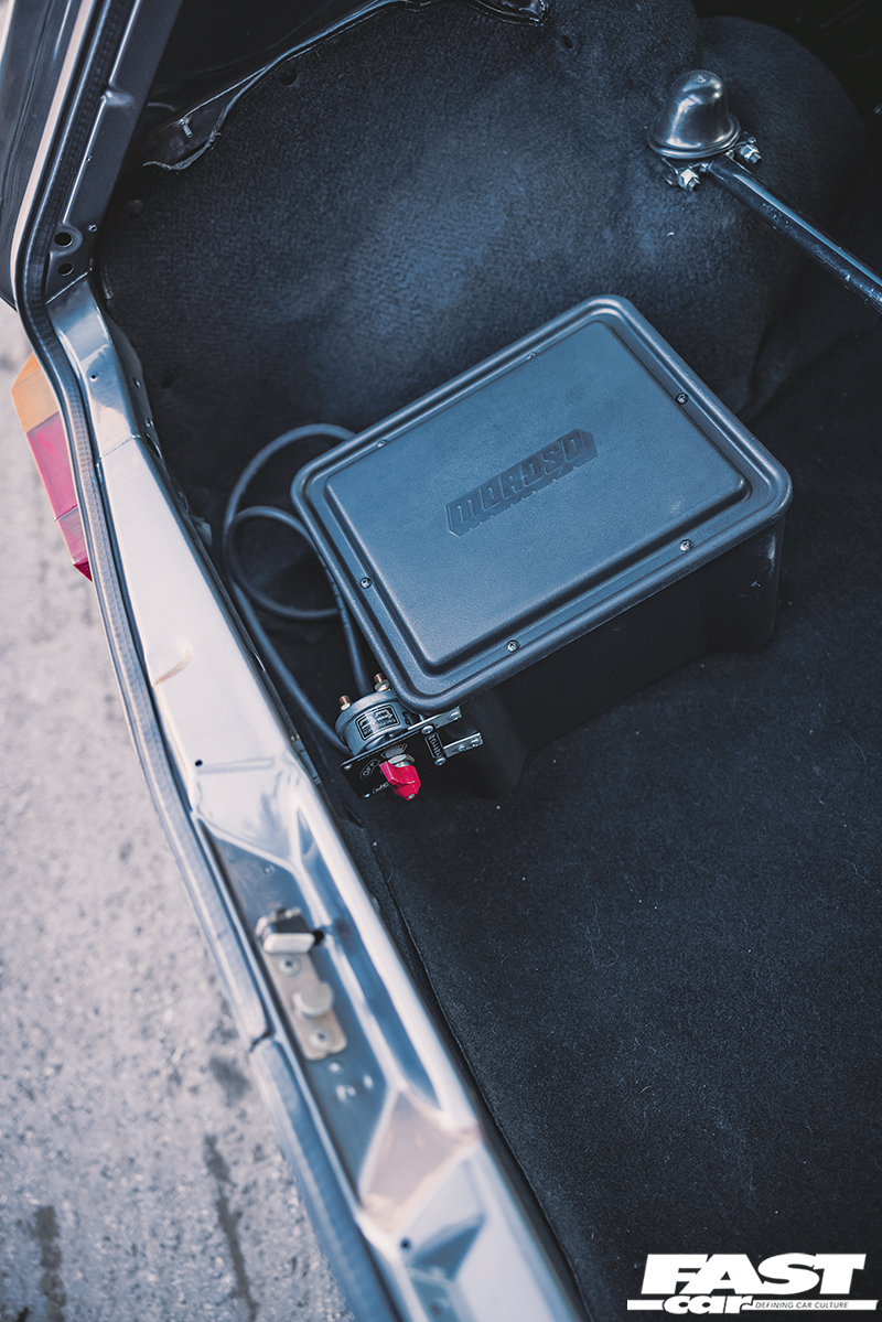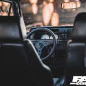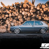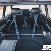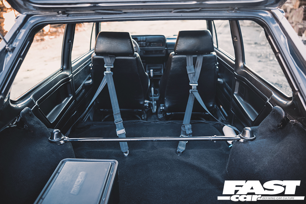 We rarely see a Mk2 dash conversion in a Mk1 these days but it looks at home with the Recaro Trophy seats and the Renown Monaco steering wheel. Black headlining, rear bench delete with carpeted rear deck, a relocated battery in Moroso safety box, harness bar and Schroth harnesses complete the sparse but well thought out and classy interior. The aforementioned sidelight delete, small Mk1 Golf bumpers and CL arch spats give the car a clean Euro look whilst the Rabbit badging acts as a nod to the car’s starting point. Stephen wanted to create a subtle car but have details that enthusiasts would appreciate. It’s certainly one of those cars you would spend a while with, drinking in all the details at a show. Who clocked the ‘postal’ rear lights (devoid of the white reversing lenses) and the clean non-defrost rear screen?