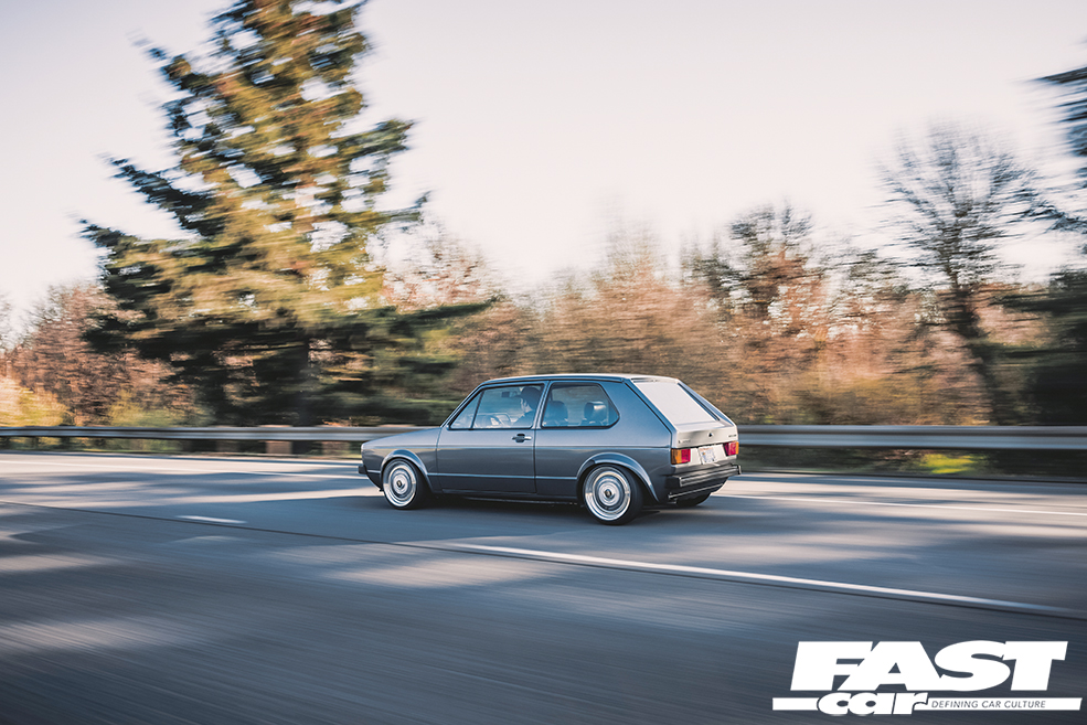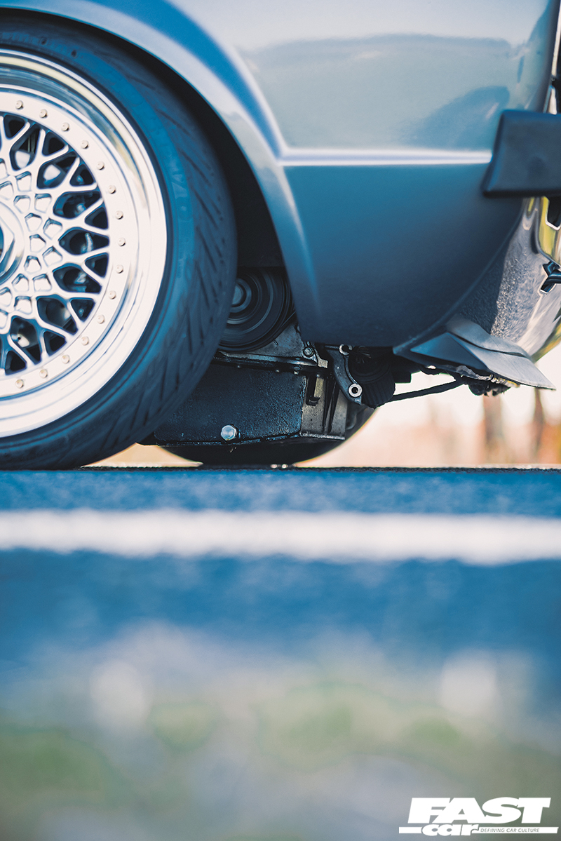 The Mk1 Golf VR6 sits perfectly over those gorgeous wheels. This is thanks to Solo-Werks coilovers with a custom spring rate up front to allow for the heft of the six-banger. Autotech upper and lower strut bars front and rear keep things taut. Those BBS RS, of course, deserve a special mention. Stephen front faced mounted the centres using gold BBS bolts. They measure up a purposeful but useable 7×16 (front) and 7.5 (rear) and suit the car perfectly.