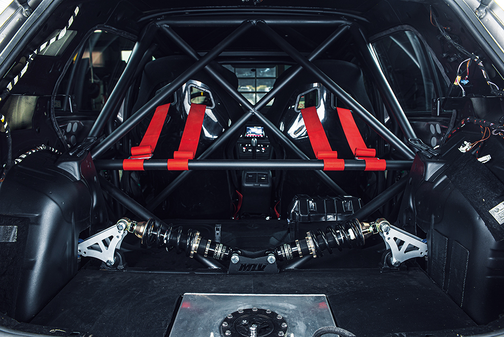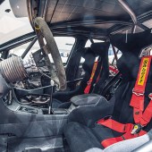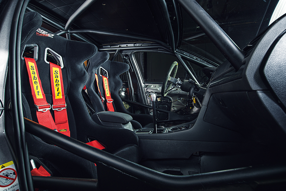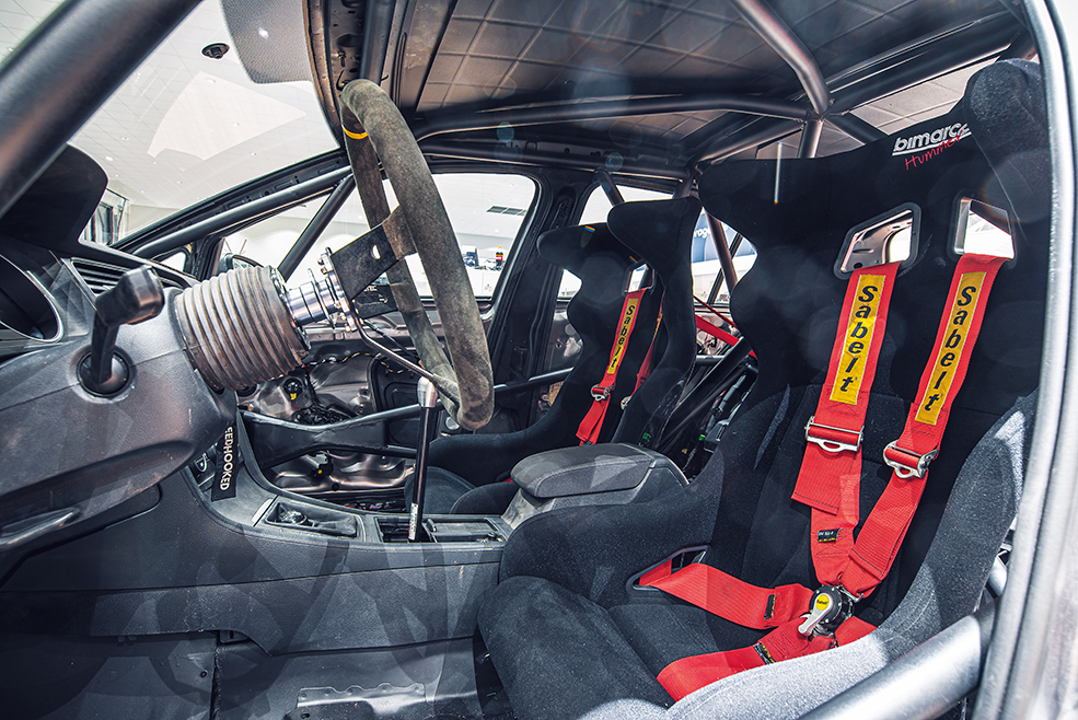 The cabin is also worlds away from this car’s past life. More than 42 metres of roll cage were added to the shell to brace every possible flex point, not only for safety but to dial in more predictable handling on track. Despite the extent of the fabrication in the centre tunnel, Toni managed to re-fit the original dashboard and make sure all of the instruments and touchscreen still work. Close the bonnet and the only hint of its new drivetrain layouts is the lengthy gearstick bursting out of the cupholders in the centre console a few inches behind the original.