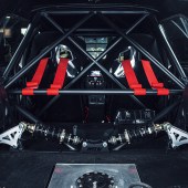 Stripped interior, custom roll cage, Bimarco Hummer bucket seats, Sabelt harnesses, suede-rimmed steering wheel with snap-off