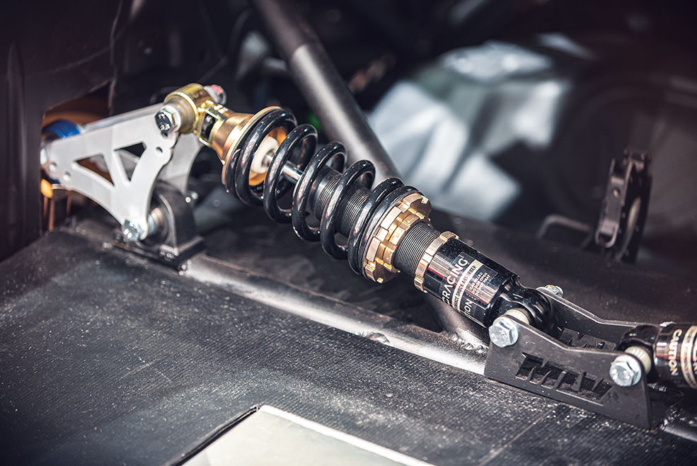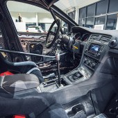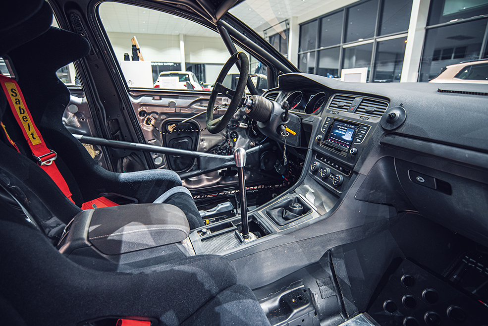 At the back, the standard upright strut layout would have limited the harder-working wheels to seven inches wide. To get around that would-be compromise, the Mk7 Golf drift car features a scratch-built pushrod system tied into a tubular frame under the boot, while the coilovers are largely based on BC Racing’s kit for the Lamborghini Gallardo.