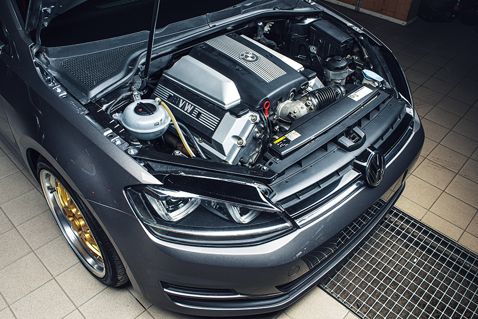 Perhaps as a result of its 18-hour winter nights, Finnish workshops are a hotbed for the sort of no-holds-barred re-engineering you’re looking at here. Beneath the unmodified bodywork of a cooking-spec Mk7, the visible bars of a substantial roll cage let slip that there’s a little more muscle packed into this car than Wolfsburg ever equipped it with. Namely the unmistakeable bellow of four litres, eight cylinders and tortured rear tyres that have turned pre-project mockery into wide-eyed approval. And yes, it essentially meant the car had to be rebuilt from scratch.