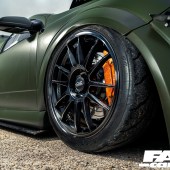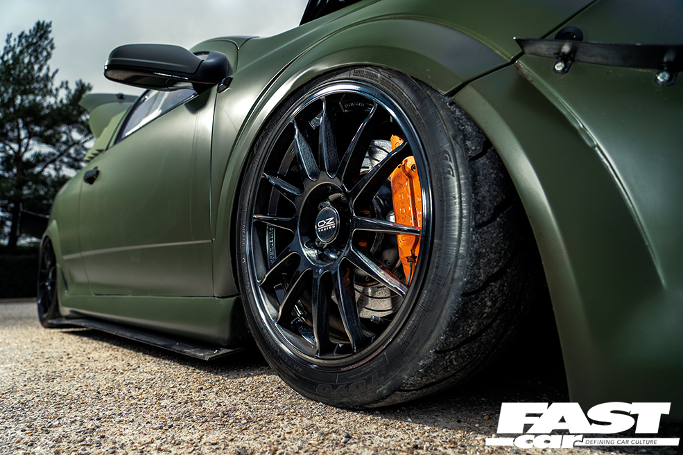 Custom wrap in Oracal matte NATO green with matte black roof, front bumper smoothed with Regal Dap R splitter smoothed in, custom splitter and canards, lowline sideskirts, rear diffuser cut out, custom chassis-mount Driftworks carbon wing, polycarbonate front windows with sliders, CM Composites louvres in rear windows – wrapped in body colour, rolled and widened front arches, Opel front grille, tinted angel-eye LED headlights and taillights, functional roof scoop