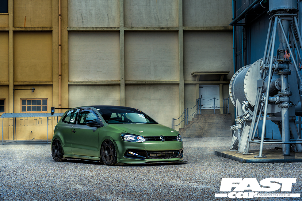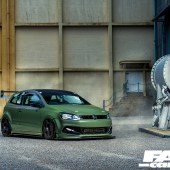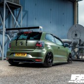 Custom wrap in 3M NATO Olive Green, smoothed Polo 6R R-Line front bumper, Polo 6R R-Line sideskirts with extensions, Polo 6C GTI rear bumper, BYC rear wing, 8mm ply front splitter, front and rear arches widened by 10mm, Polo 6R clear Euro taillights, carbon fibre mirror covers, custom bumper ties, bonnet latches, gloss black painted grilles