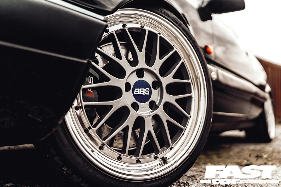 8.5x19in ET47 BBS Le Mans 154 (front) and 9.5x19in ET47 BBS Le Mans 155 (rear) – polished lips and blue centre caps, 235/35 (f) and 265/30 (r) Hankook Evo S1 tyres, 15mm track plates, Gepfeffert KW V3 Competition Deep coilovers with adjustable camber plates, Audi RS3 front brakes with 370mm discs, VW Phaeton rear brakes with 330mm discs
