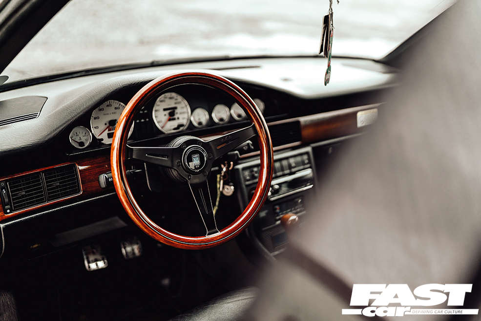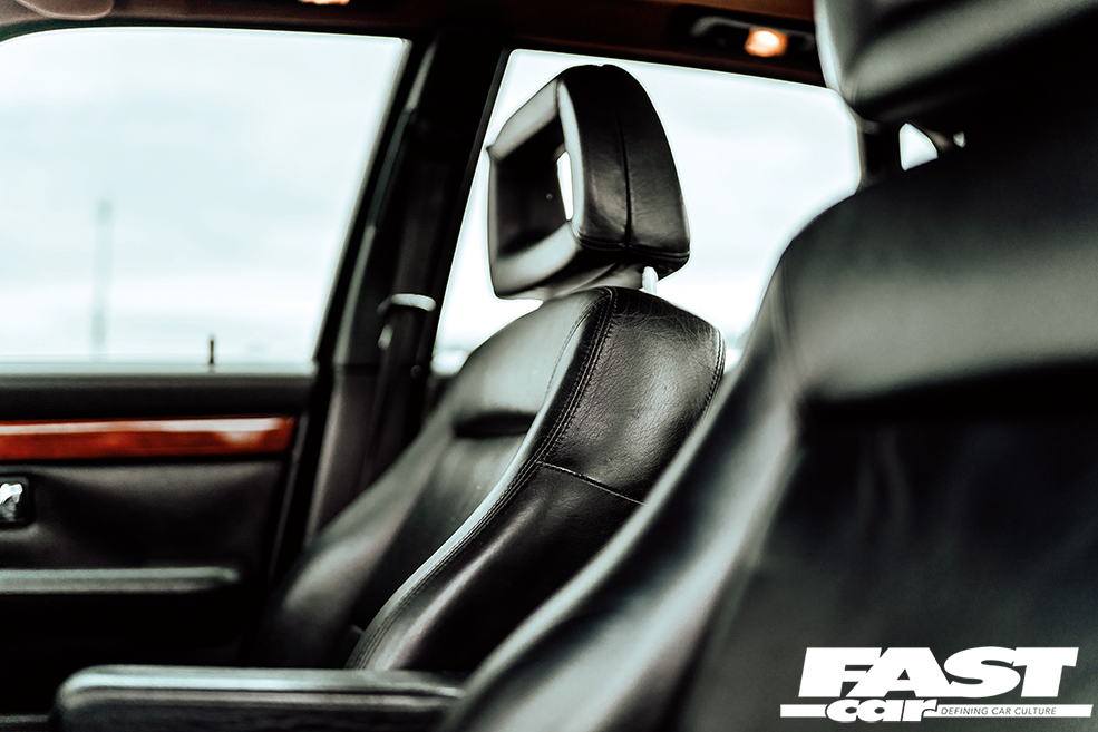 The aim here was for some extreme static lows, but with quality componentry to allow him to deploy that power effectively with decent and predictable handling. Scene superheroes Gepfeffert came to the rescue here, with a set of their custom-modified KW V3 coilovers, allied to camber-adjustable top mounts. The brakes have been logically upgraded, as you can’t really expect 1990-spec saloon car stoppers to happily deal with 450 horses without wilting; the 200 now wears RS3 brakes with 370mm discs up front, while the rear sports a VW Phaeton setup with 330mm rotors. The wheels they sit behind are frankly phenomenal, imbuing the chunky saloon with a real contemporary Touring Car vibe, tucking the vast 19” diameter right up inside the flawless original arches. They’re BBS Le Mans splits, if you were wondering, and they pull off the neat trick of being period-perfect while also really modernising the vibe.