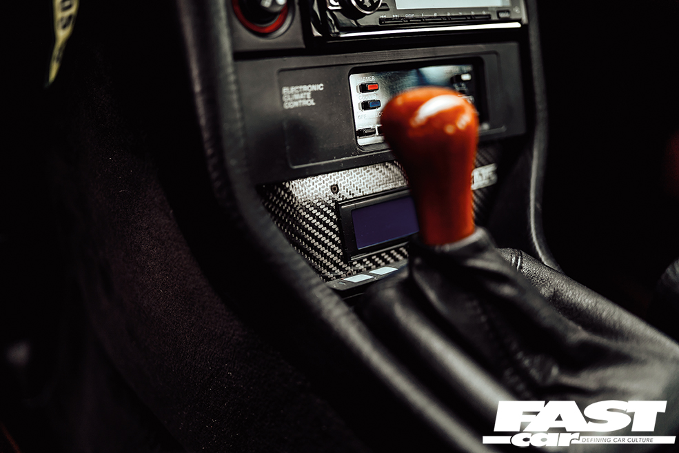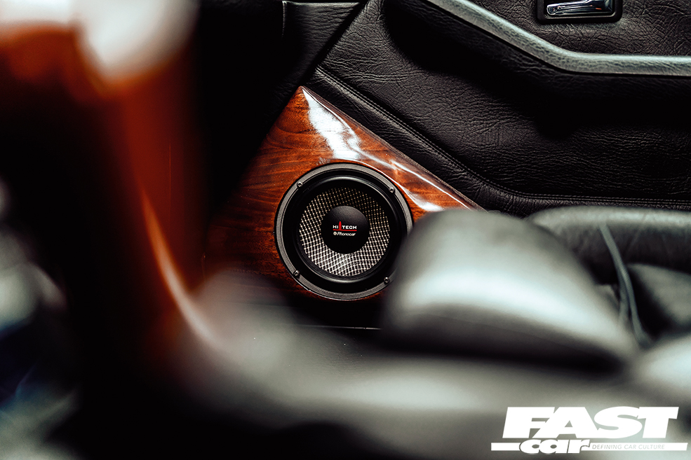 Black leather Audi V8 Exclusive Sport interior, brown Alcantara headlining, black RS2 handles, Nardi steering wheel, wood gearknob, home-made wood door inserts, Alpine head unit, Phonocar Hi Tech door speakers, 10-inch sub