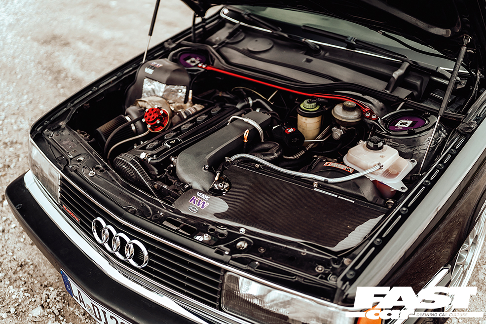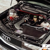 2.2-litre ABY 5-cylinder 20v (from Audi S2), Garrett GT30/76 turbo, VEMS programmable ECU, 630cc Siemens injectors, Bosch 044 fuel pump, custom home-made charge cooler, Porsche catch can, tubular manifold, home-made 76mm exhaust system, tuned by Audiland and PK Motorsport, original 5-speed