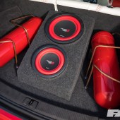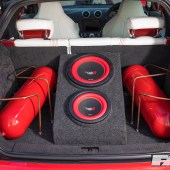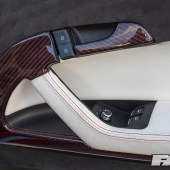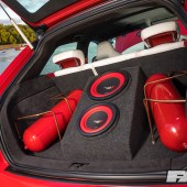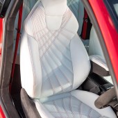 S5 front seats re-trimmed in white nappa leather and red stitching; Alcantara door cards, roof lining, boot trims and replacement plastic trim; custom iPad dash enclosure; full Cerwin Vega ICE setup with Audison Bit One digital processor.