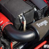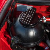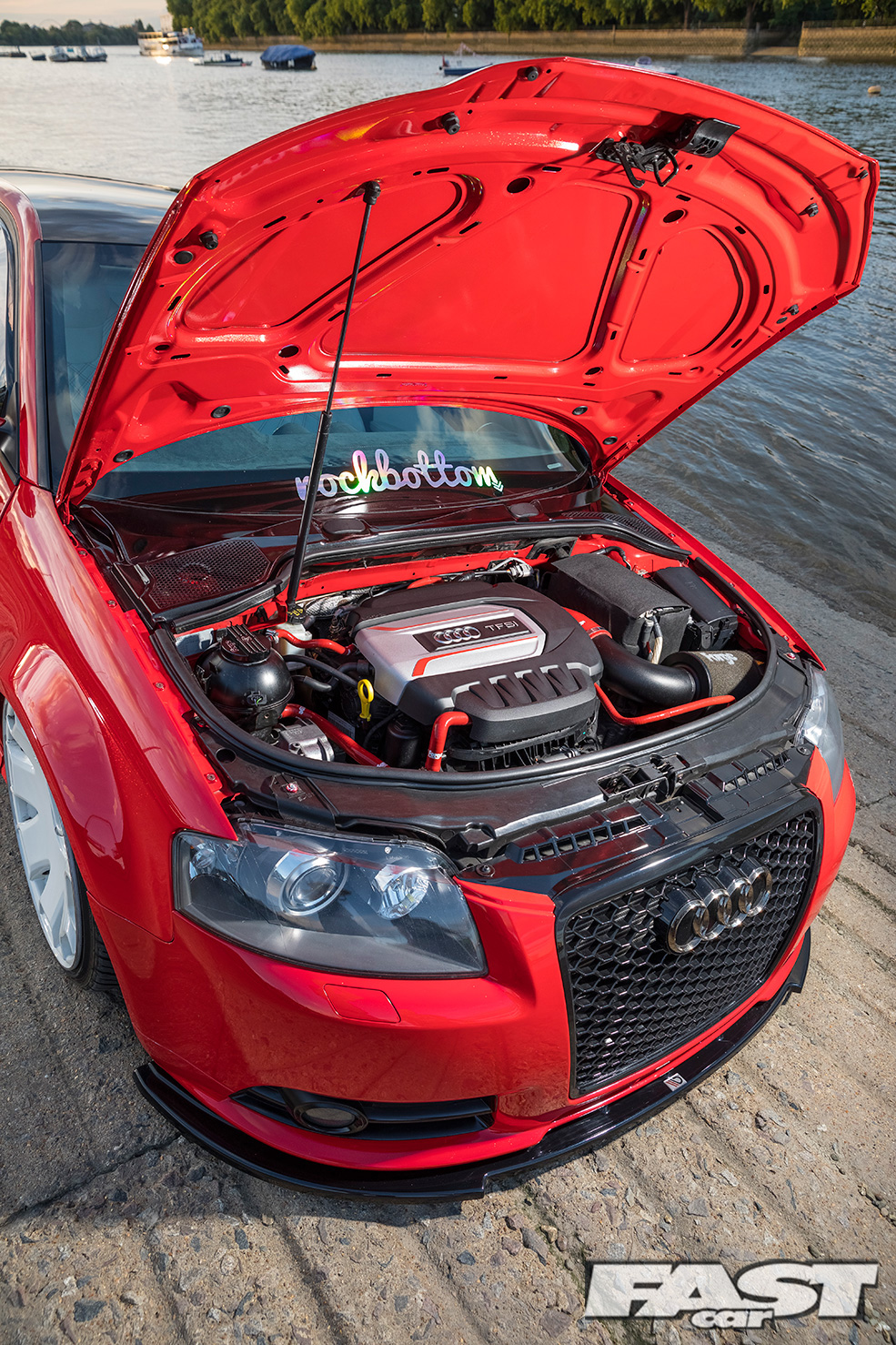 2.0-litre TFSI 8V S3 engine conversion; Forge Motorsport front-mount intercooler, red hoses, custom air intake; custom 3in turbo-back exhaust system; half-shaved engine bay.