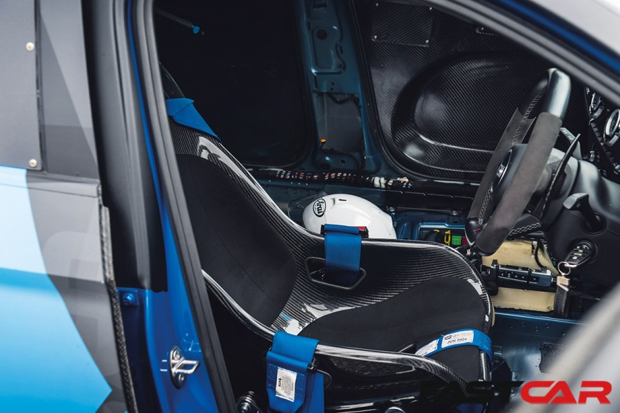 Despite the excessive horsepower on tap, none of that performance was wasted on creature comforts. Swapping steel doors and glass windows for Mcomposit carbon fibre and polycarbonate shaves 63kg from the Audi’s kerb weight, while the bootlid sheds another 9kg. Most of the RS 3’s luxurious interior has also been stripped out, including half of the dashboard and everything below the shoulder line except for the airbags. Aside from the carbon fibre Tillett bucket seat and harnesses, there isn’t much left.