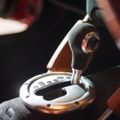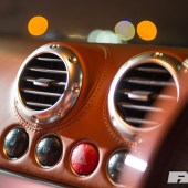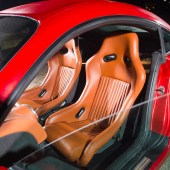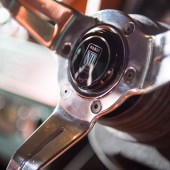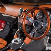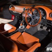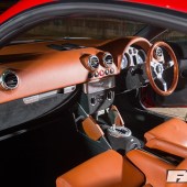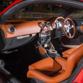 Full retrim in brown Bridge of Weir nappa leather with white stitching, fixed-back buckets with backs trimmed in charcoal suede, dash bottom and centre console trimmed in charcoal suede, Nardi Deep Corn mahogany steering wheel, air controller custom-fitted into roof lining