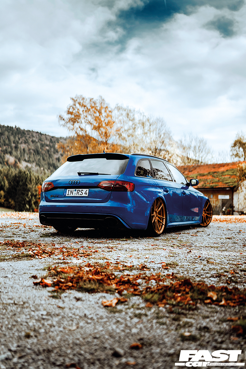 At first glance it’d be natural to assume that this car is bagged, as its low-slung stance appears to suggest that it’s aired out over those oversized 21-inch ADV.1 rims. But no – somewhat unbelievably, this full-fat wagon is rolling static. How has this been achieved? It’s all down to the engineering ingenuity of Gepfeffert, a name you’ve almost certainly come across in relation to the Euro tuning scene. What these suspension eggheads do is to take high-quality KW coilovers and artfully re-configure them to allow the cars in question to run ultra-low without compromising any of the inherent handling characteristics of the high-performance upgrade setup. Naturally this brings with it its own clearance issues, hence why the modified B8 RS4 is now wearing subtly wider front wings from Muecke to allow a bit more steering angle, and the overall effect is utterly devastating. The way this Audi prowls is supremely menacing, like it’s hoovering up the tarmac in the hunt for fresh meat.