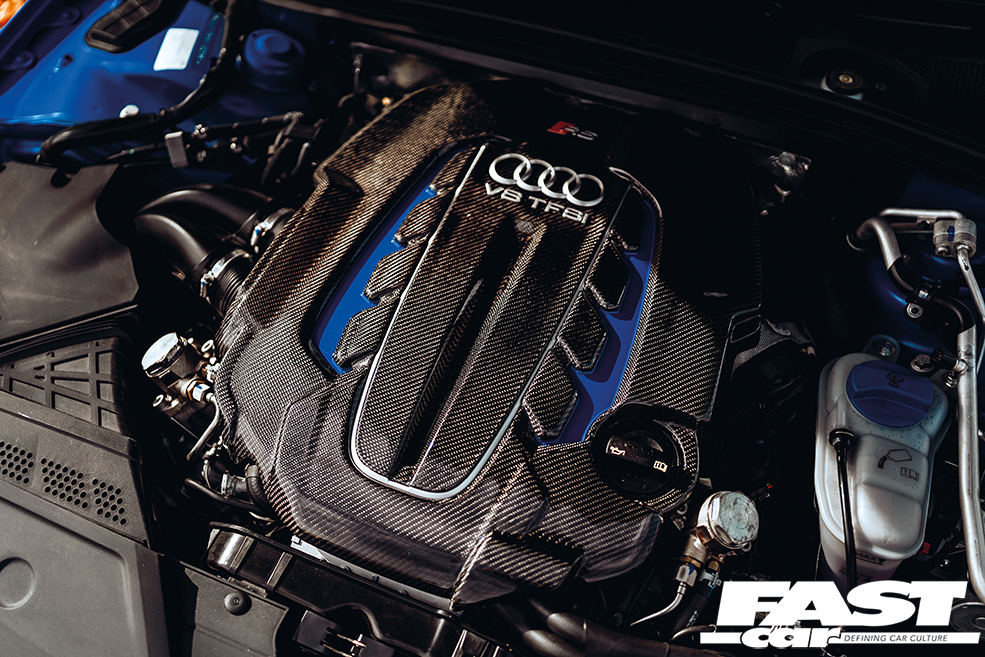 Clearly there’s no standing on ceremony here. You see, for all the RS4’s merits, for its staggering performance, its 450bhp and sub-5-second 0-62mph time, the idea of shoving a quart into a pint pot was always the game-plan. And the headline notion was to take the twin-turbo 4.0-litre TFSI V8 from the C7-generation RS6 and turn the blue bruiser up to eleven. It’s an incredibly bold idea, as the TFSI lump kicks out 553bhp in stock form, along with a brutal 516lb.ft of torque, and the notion of taking a cutting-edge motor and replacing it with another from the same stable that’s amped up to the next level is not to be taken lightly. This isn’t like it was in the old days, when you’d just hoik out your carb-fed SOHC on a home-made engine crane and drop a bigger motor in – nowadays such things take some serious qualifications in electrical engineering simply to get the wiring to work, let alone getting the powertrain to actually fit.
