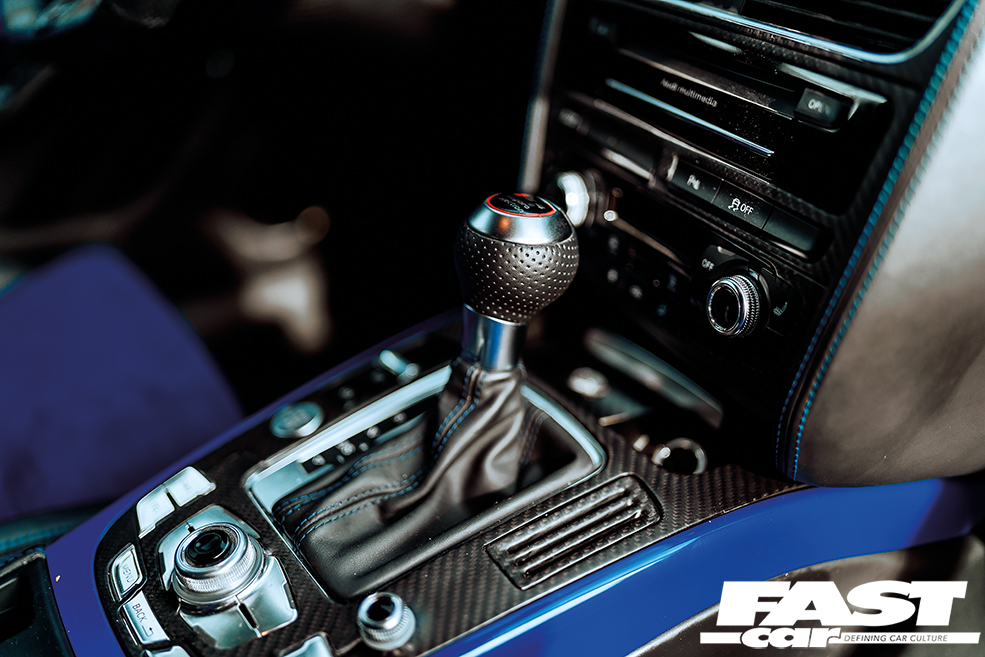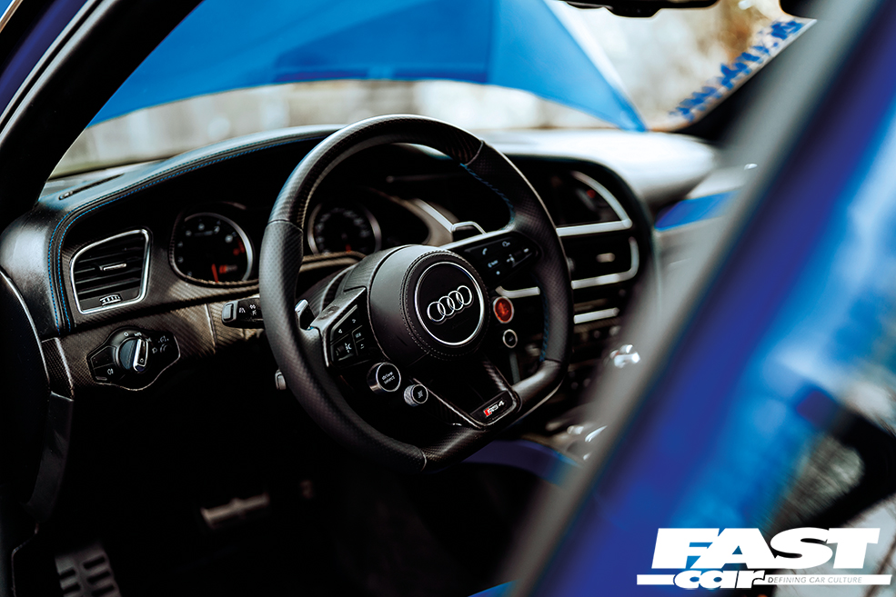 Martin Lanzinger is the de facto figurehead of the tribe, so it’s his brains we’re picking to clue ourselves up on the specifics of the tale here, and it comes from an interesting starting point. “It’s a limited edition RS4 Nogaro Selection that we bought from an Audi dealer,” he explains. And this is intriguing, as Audi die-hards are generally quite keen on the preservation and salvation of limited editions. This particular one was launched in 2014 to celebrate the twentieth anniversary of the RS2, wearing a tribute paint shade of Nogaro Blue with a little extra pearl thrown into the mix. It had a few tasteful stylistic tweaks, like matte black roof rails, gloss black grille and window surrounds, and half-leather seats with blue Alcantara inserts to mimic those of the old RS2. The blue theme was rife throughout, with the leather having blue stitching, the carpets getting blue piping, and even blue strands woven through the carbon fibre trim. It cost about £8,000 more than a regular RS4 when new, so it’s fair to say this is a very rare and revered beast