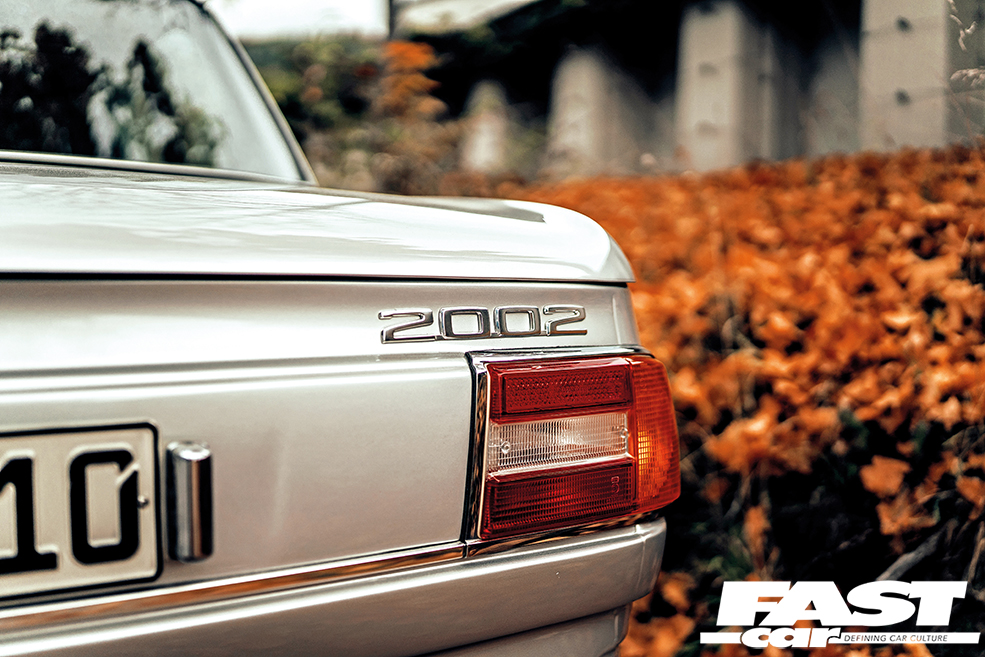 With the engine work taken care of, Georg and his dad now moved onto the next major part of the project, the bodywork. As the inspiration for the project was the Group 2 2002 that they had seen at BMW Group Classic, the plan was to create a road-going car with that awesome wide-arch Group 2 styling and so the next step was to order the body kit, which consists of that ultra-aggressive front bumper and the bolt-on arches. “It wasn’t all that easy to get the parts fitted in place as there were no pre-drilled holes to fit the body in place. Let’s just say, it paid for me to be a fully trained mechanic,” grins Georg and his talent and skills paid off in a big way as the end result is spectacular and while the kit may only be made up of the front bumper and arches, the visual drama they impart on the 2002’s body is insane. The front bumper is wide and wild, angular and aggressive with that central ‘V’ section, those air intakes and the lower splitter section, and it aligns with the front arches, which sweep up and over and then tuck down into the sills and not only do they endow the 2002 with an almost cartoonish muscularity, the bolts and the black gaskets add an element of contrast and give them even more definition. At the rear, meanwhile, Georg has removed the bumper and cleaned up the area to leave the ’02’s rump looking super smooth, with that exceedingly cool oval exhaust tip from the custom manifold-back exhaust system adding the finishing touch. With the Group 2 elements in place, the body needed a fresh coat of paint and while you might not think silver is an especially exciting choice of colour, this isn’t just any silver, oh no, this is Mercedes Brilliant Silver metallic, which Georg says gives a hint of golden glow in full sun, adding yet another element to the visual aspect of this build.