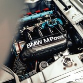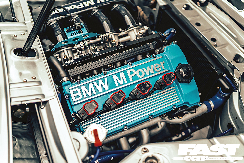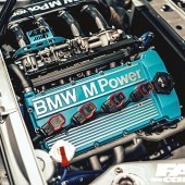 2.5-litre four-cylinder S14B25 from E30 M3 Sport Evo, lighter DTM crankshaft, H-beam Pauter connecting rods, one-off Wössner pistons, BMW Motorsport DTM camshafts, mechanical bucket tappets, machined cylinder head, enlarged and polished intake and exhaust ports, increased compression ratio, E34 M5 valves, genuine DTM carbon air box and intake manifold, Audi R8 ignition coils, custom-made enlarged sump, electronic water pump, E30 M3 exhaust manifold, homemade manifold-back exhaust system, MBE ECU, engine bay tidied. Getrag 265 five-speed manual gearbox from E30 M3, enlarged transmission tunnel, 45% locking LSD