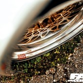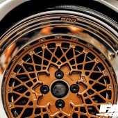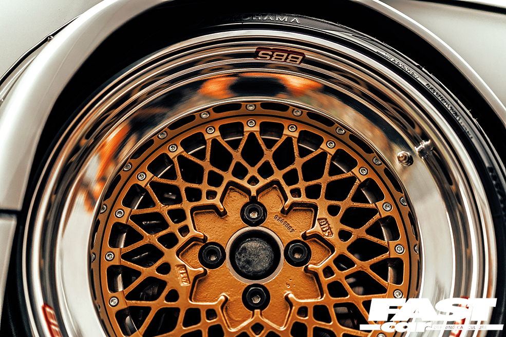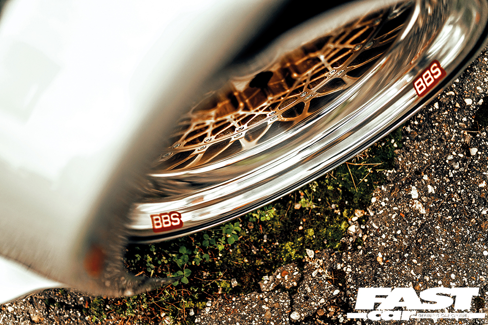 9.5×17” (front) and 11×17” (rear) BBS E50 magnesium wheels with gold centres and polished stepped lips, 225/35 (front) and 255/45 (rear) Yokohama Advan Fleva tyres, Bilstein coilovers, E21 323i rear axle and welded suspension turrets, modified to MacPherson suspension struts, springs welded in, Porsche 993 911 Turbo four-piston calipers and 330mm discs (front) and E21 323i single-piston calipers and 258mm drilled discs (rear)