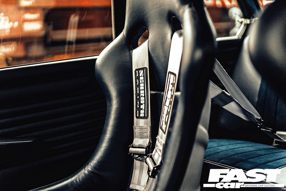 Porsche 993 911 GT2 seats, silver Schroth harnesses, interior retrimmed in Porsche blue leather and blue Alcantara, custom-mounted Stack digital race display with carbon fibre surround, custom carbon fibre centre console, Momo Motorsport steering wheel with BMW centre badge, BMW M gear knob, Audi TT gear shift surround