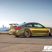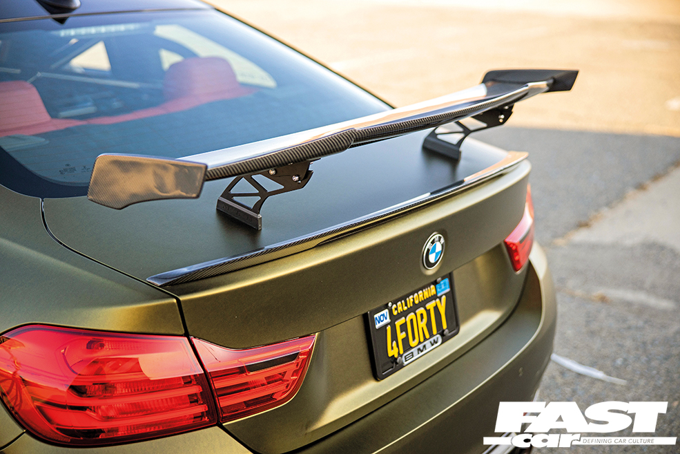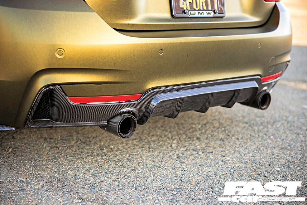 Jermhel now had himself a very smart-looking modified BMW 440i with some decent power but it was time to really up the ante and it was at this point, with the third wave of mods, that things really got taken to the next level and it’s all thanks to that incredible body kit. “When I was young, I used to look up modified BMWs on Google. One of the cars that kept popping up was a wide-body E92 M3 in olive green. Ever since I saw that vehicle, I wished one day I would be able to build a car like that. That vehicle inspired me do build the car that I have today,” says Jermhel with a smile and the end result was well worth the effort. The 440i wears an SR66 Design wide-body kit wrapped in Golden Matt Black with the fitting of both these elements having been assigned to Stealth Labs in Belmont California and this combo makes the F32 look utterly awesome. The bolt-on arches are so incredibly aggressive, serving up a serious helping of road presence and we like the little details like the way they accentuate the car’s front wing vents, while the wrap is simply stunning, taking on a variety of different shades of gold depending on the light and together they have completely transformed this 440i. There’s more to this 4 Series’ sheer visual drama than just that kit and the wrap, though, and Jermhel has also added a selection of carbon enhancements from Morph Auto Design including front bumper upper valances, side blades and that aggressive GT wing, and in addition to that this car has also been equipped with Mashimarho carbon bumper side extensions and a carbon rear diffuser for that full-on final flourish.