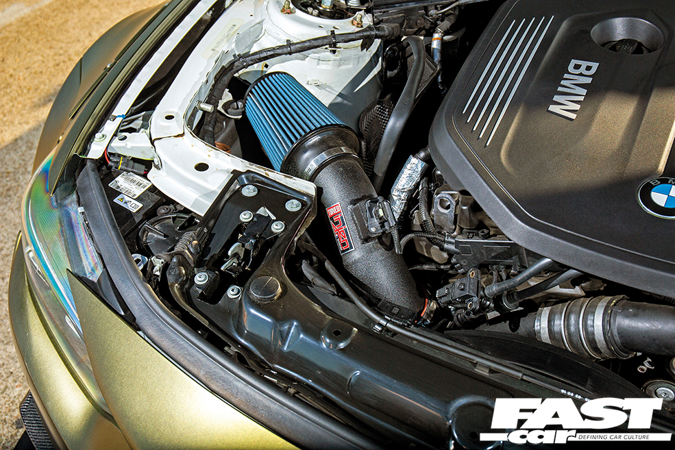 In addition to the air suspension, this second stage of mods also saw the F32’s exterior receiving some serious visual enhancement with Jermhel fitting an aggressive Seibon VR-Style carbon fibre vented bonnet, which the car still wears now, those equally aggressive Bayoptiks headlights (his favourite mod on the whole car, incidentally) and a CSL-style carbon fibre boot lid. At this point, he also turned his attention to the engine because, if you recall, his very first plan was to make the car fast and that wasn’t something he’d forgotten about. “My first performance mods were the M Performance Power & Sound Kit (MPPSK) and an Evolution Racewerks cat-less downpipe. I loved how the M Performance exhaust sounds; it had a deep tone, low growl with burbles and pops. As soon as I paired the exhaust with the downpipe, it enhanced the entire sound of the exhaust and I felt like I had the perfect exhaust note. I wanted something loud but nothing obnoxious and I feel the two combined together was perfect for me,” he explains. This was his performance setup for the majority of the build but, recently, he added a few more ingredients into the mix, fitting an Injen SP short ram intake, CSF V1 heat exchanger and a bootmod3 Stage 2 tune to really up the ante but he’s not done yet.