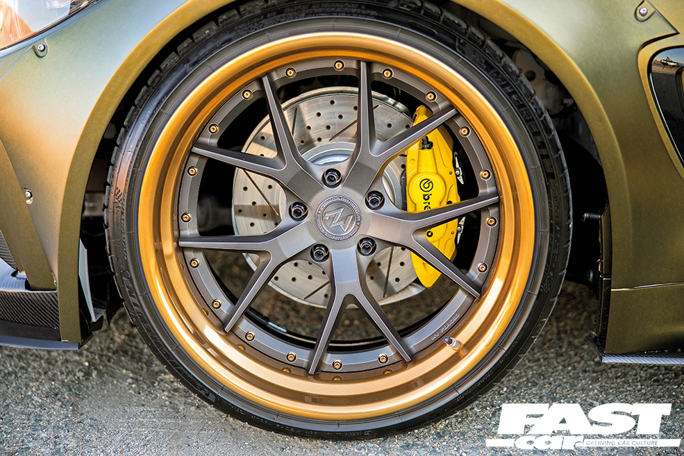 11.5×20” (front) and 12.5×20” (rear) MV Forged custom three-piece SV1 Corsa Series wheels with Carbon Black centres, Carbon Bronze lips and exposed hardware, 275/30 (front) and 305/25 (rear) Michelin Pilot Sport 4S tyres, Air Lift Performance 3P suspension, M Performance brakes with yellow calipers, R1 Concepts Geomet slotted/drilled discs