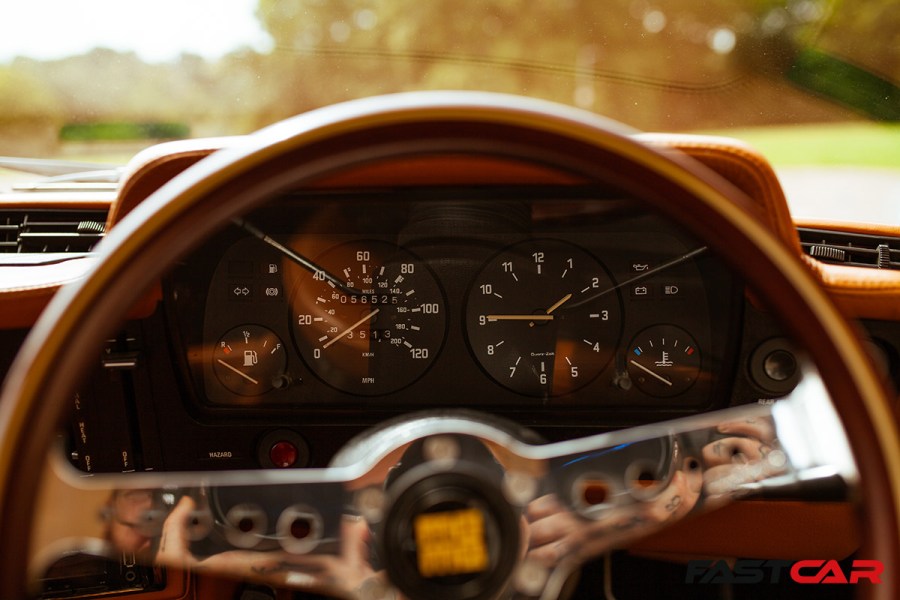 We’re really not big fans of drab, dark, black and grey cabins, so show us an interior with some colour, some flair and uniqueness, and we come alive, and Benny’s E21 interior is really hitting the spot for us. He’s opted for a rich caramel shade, and that warm leather is everywhere you look – on the door cards, the centre console, and the whole dash is wrapped in it. It offers the perfect striking contrast to the subtle, understated exterior, and we love the wooden Momo steering wheel and wooden gear knob that tie in perfectly with the leather colour and work so well with the whole retro vibe.
